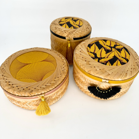 Handcrafted by artisans in Vietnam, these traditional baskets will be turned into elegant, personalized organizers by your own hands.
