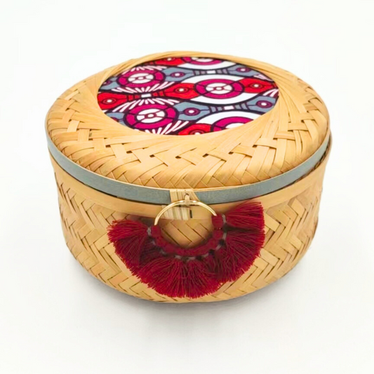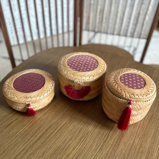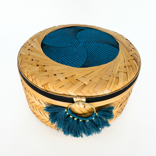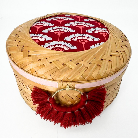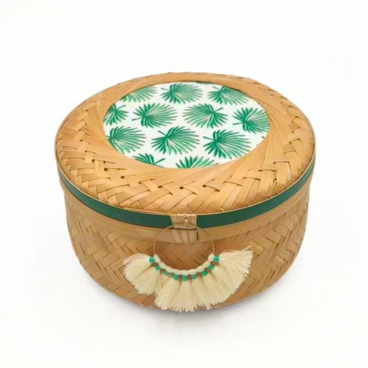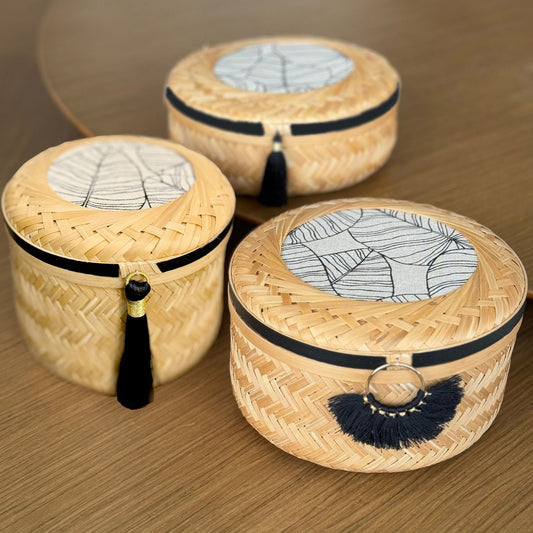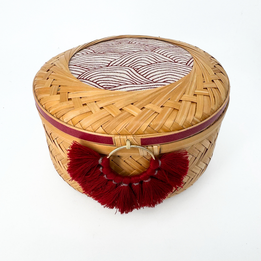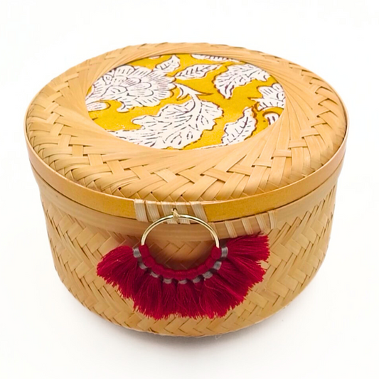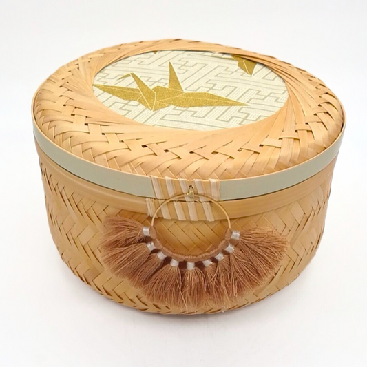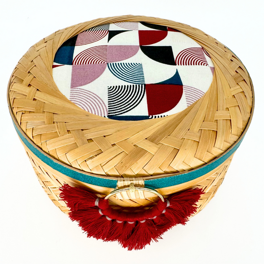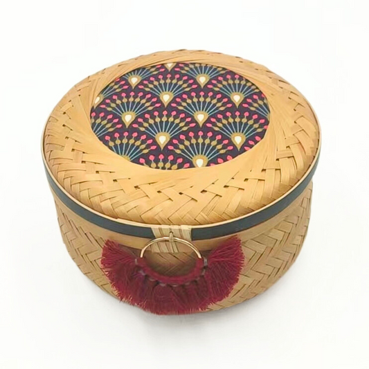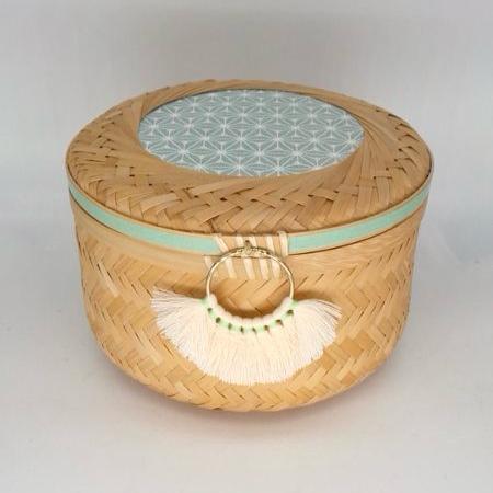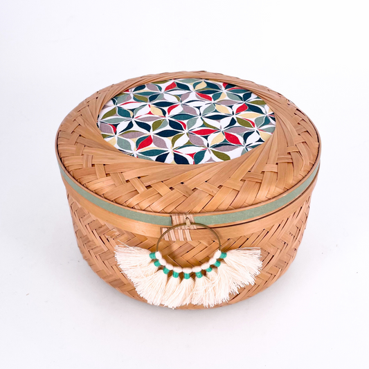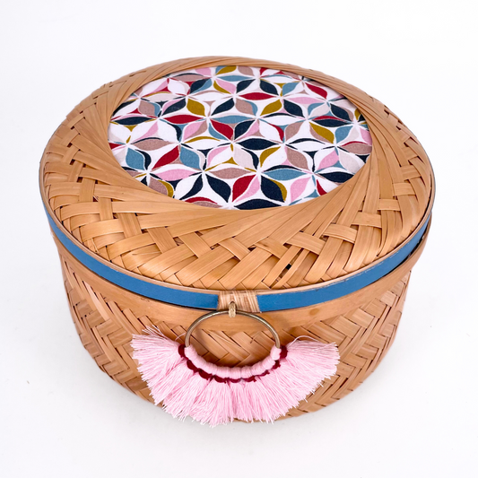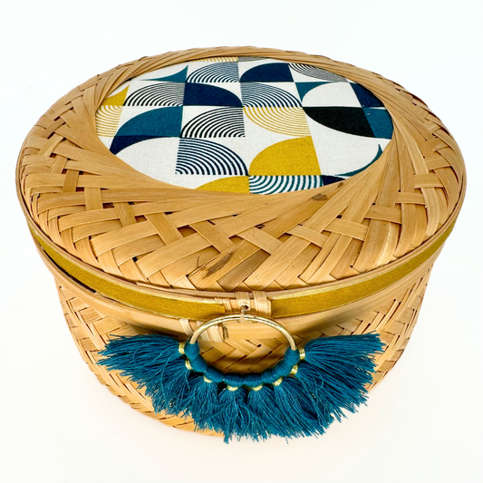 This cylindrical bamboo basket features a lid adorned with coordinated fabric and washi tape,