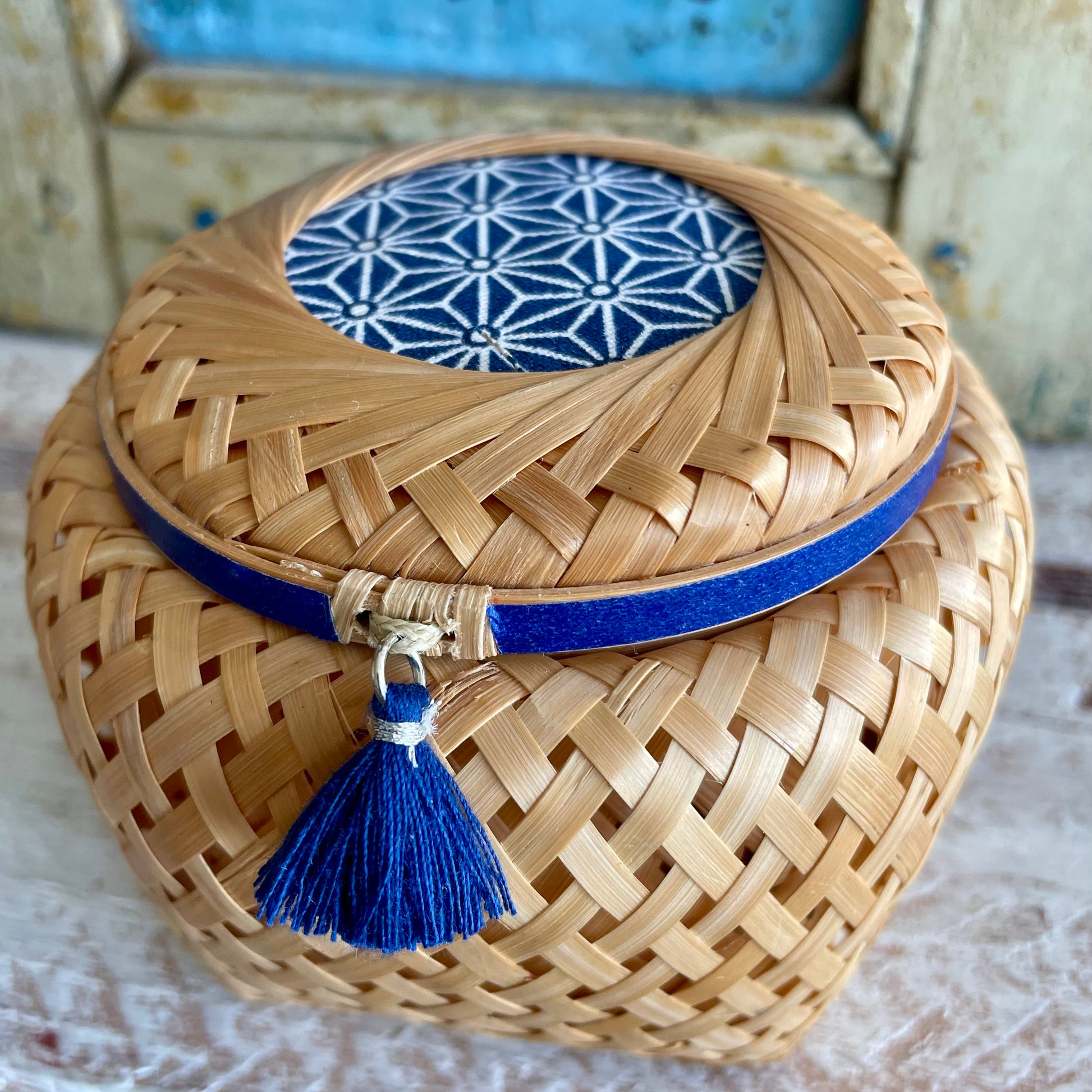 A modern twist on traditional Asian weaving, this bamboo basket features a square base and a softly rounded lid, creating a graceful silhouette. It’s adorned with a delicate fabric, a matching tassel, and decorative washi tape — each element carefully chosen to complement the basket’s natural tones and add a touch of charm. Its natural texture brings warmth, while the compact size makes it perfect for storing lipsticks, hair clips, or other small essentials.