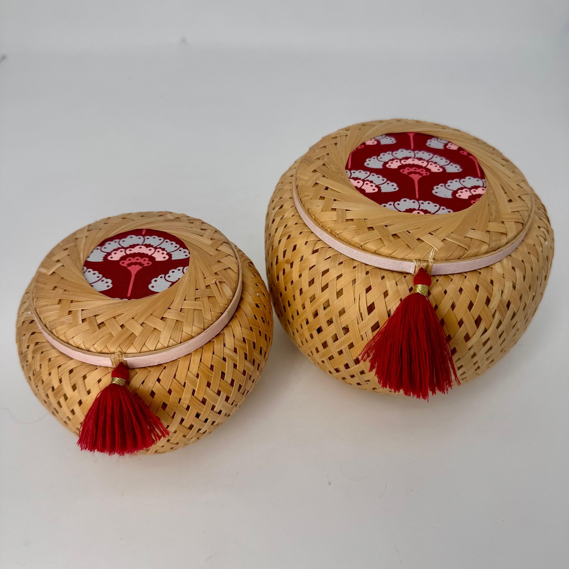 Blending heritage craftsmanship with modern understated elegance, this round-shaped basket features intricate weaving, coordinated fabric accents, washi tape, and a matching tassel. It brings a sense of calm and beauty to any space. Its versatile form is perfect for storing everyday essentials, from hair ties and cotton pads to tea bags or coffee capsules.