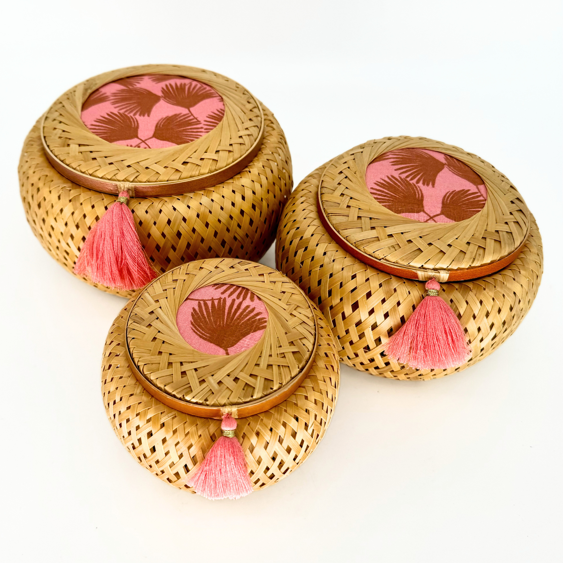 Blending heritage craftsmanship with modern understated elegance, this round-shaped basket features intricate weaving, coordinated fabric accents, washi tape, and a matching tassel. It brings a sense of calm and beauty to any space. Its simple form makes it ideal for storing makeup, craft supplies or cables and chargers.