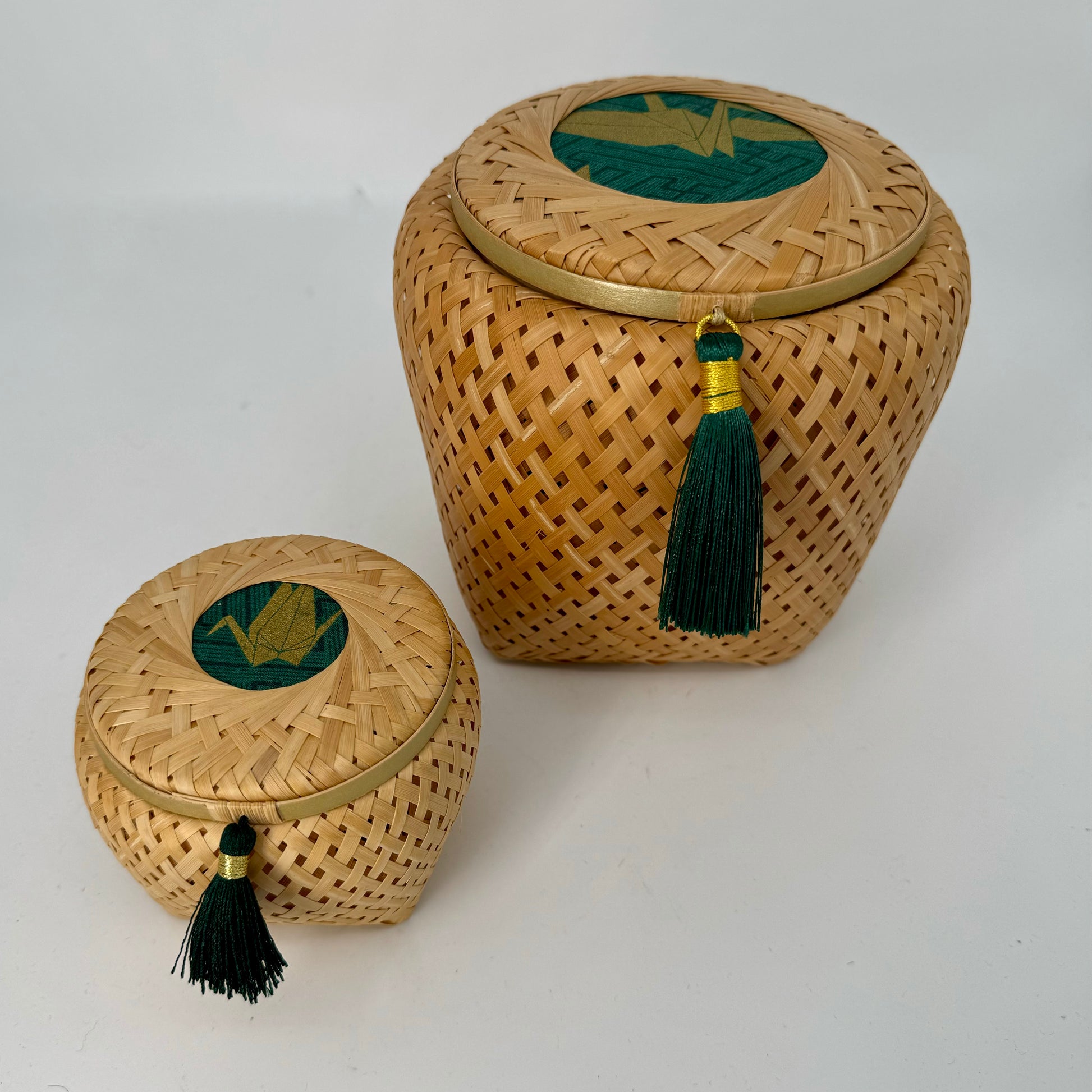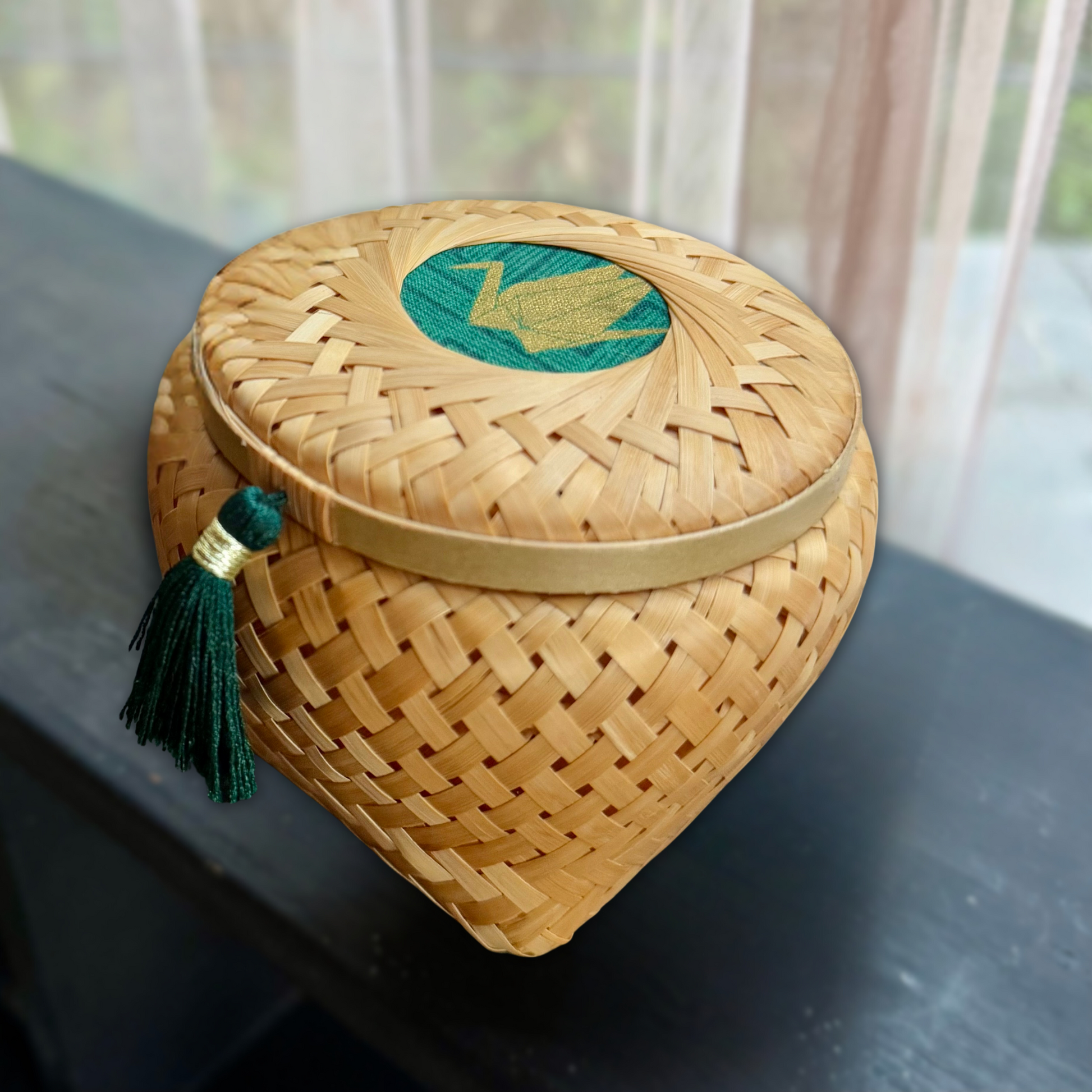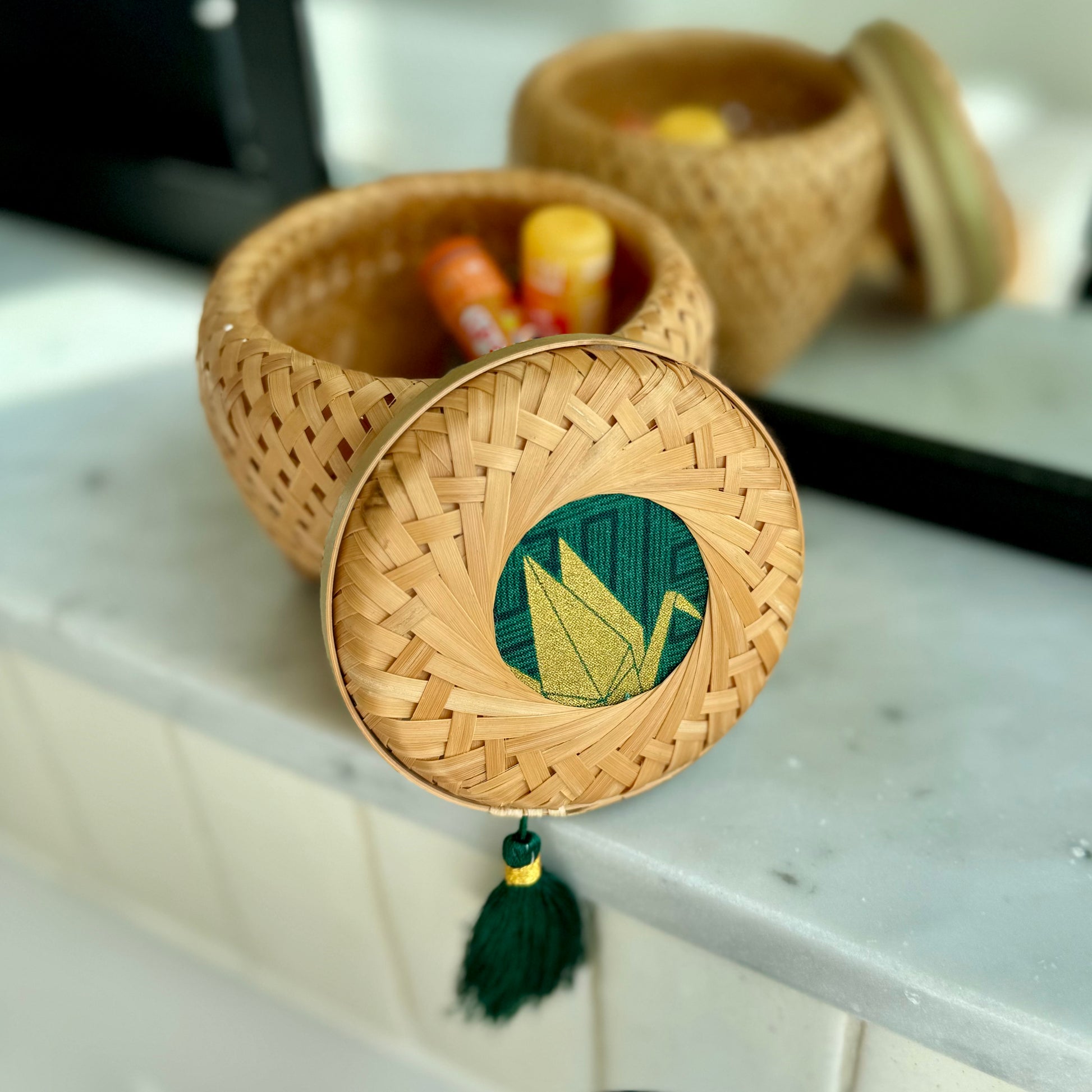 A modern twist on traditional Asian weaving, this bamboo basket features a square base and a softly rounded lid, creating a graceful silhouette. It’s adorned with a delicate fabric, a matching tassel, and decorative washi tape — each element carefully chosen to complement the basket’s natural tones and add a touch of charm. Its natural texture brings warmth, while the compact size makes it perfect for storing lipsticks, hair clips, or other small essentials.
