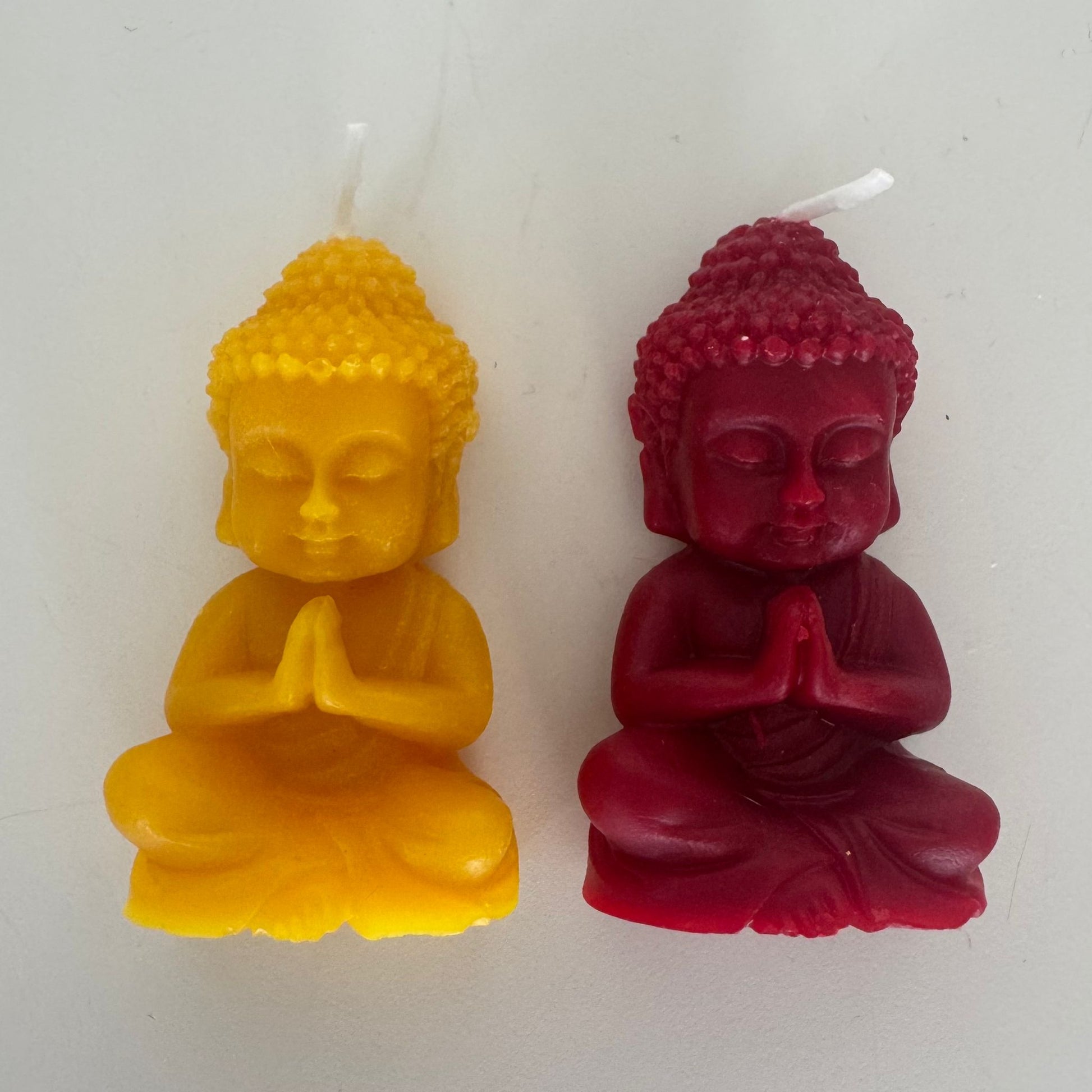Buddha: a serene, meditating Buddha crafted from a natural beeswax–soy blend. One off-white with gold flakes, and another in a shade that beautifully complements your SAN | XIA basket.