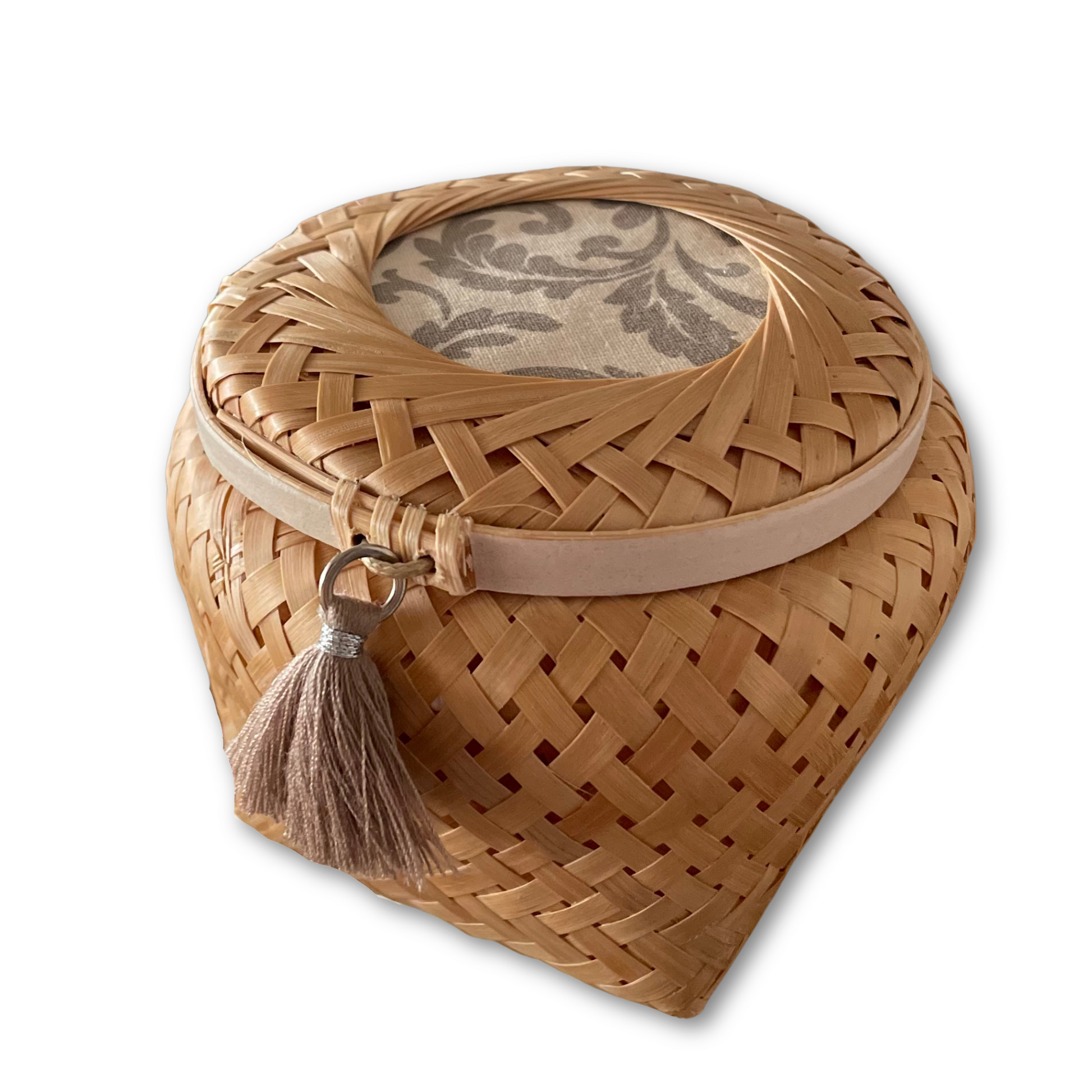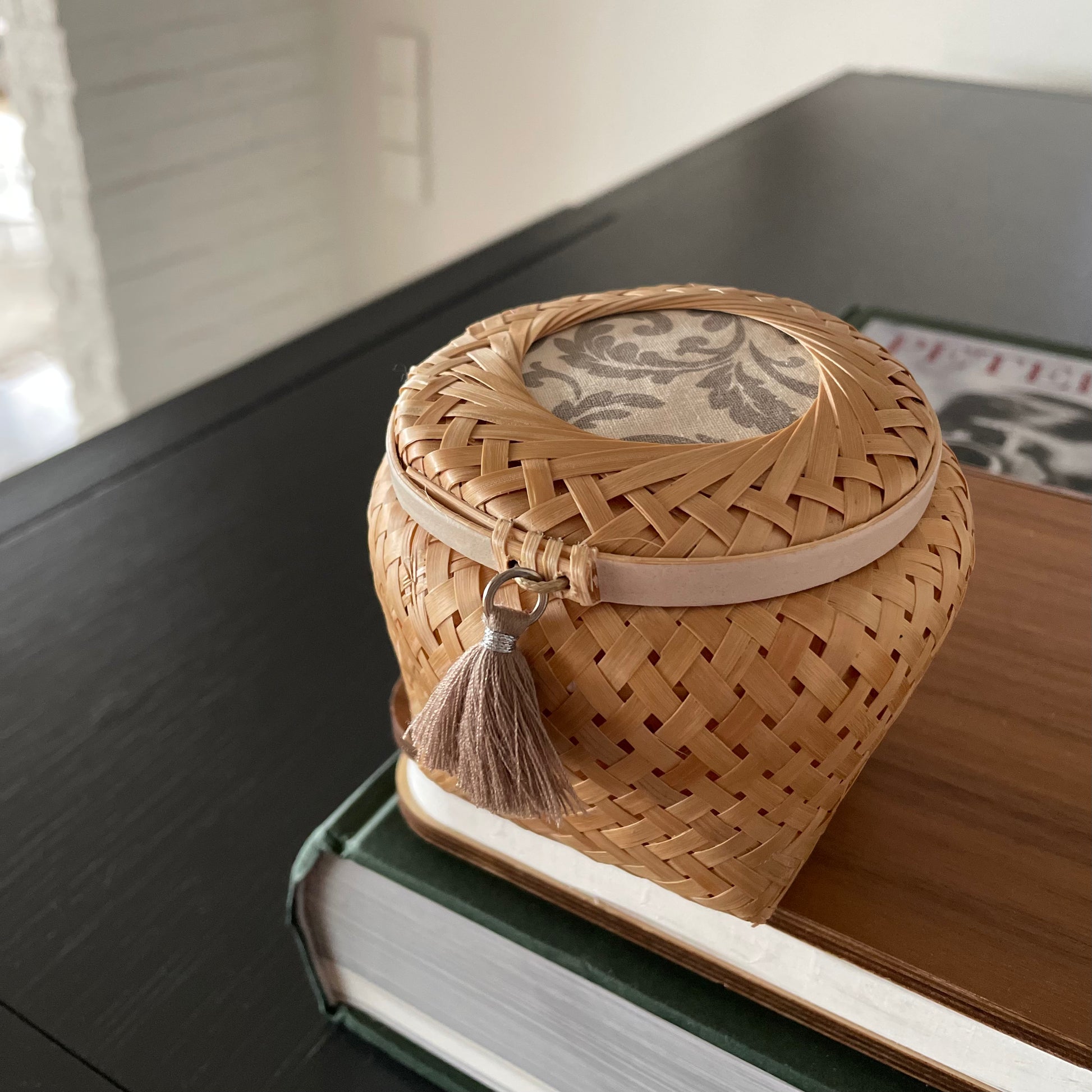 A modern twist on traditional Asian weaving, this bamboo basket features a square base and a softly rounded lid, creating a graceful silhouette. It’s adorned with a delicate fabric, a matching tassel, and decorative washi tape — each element carefully chosen to complement the basket’s natural tones and add a touch of charm. Its natural texture brings warmth, while the compact size makes it perfect for storing lipsticks, hair clips, or other small essentials.