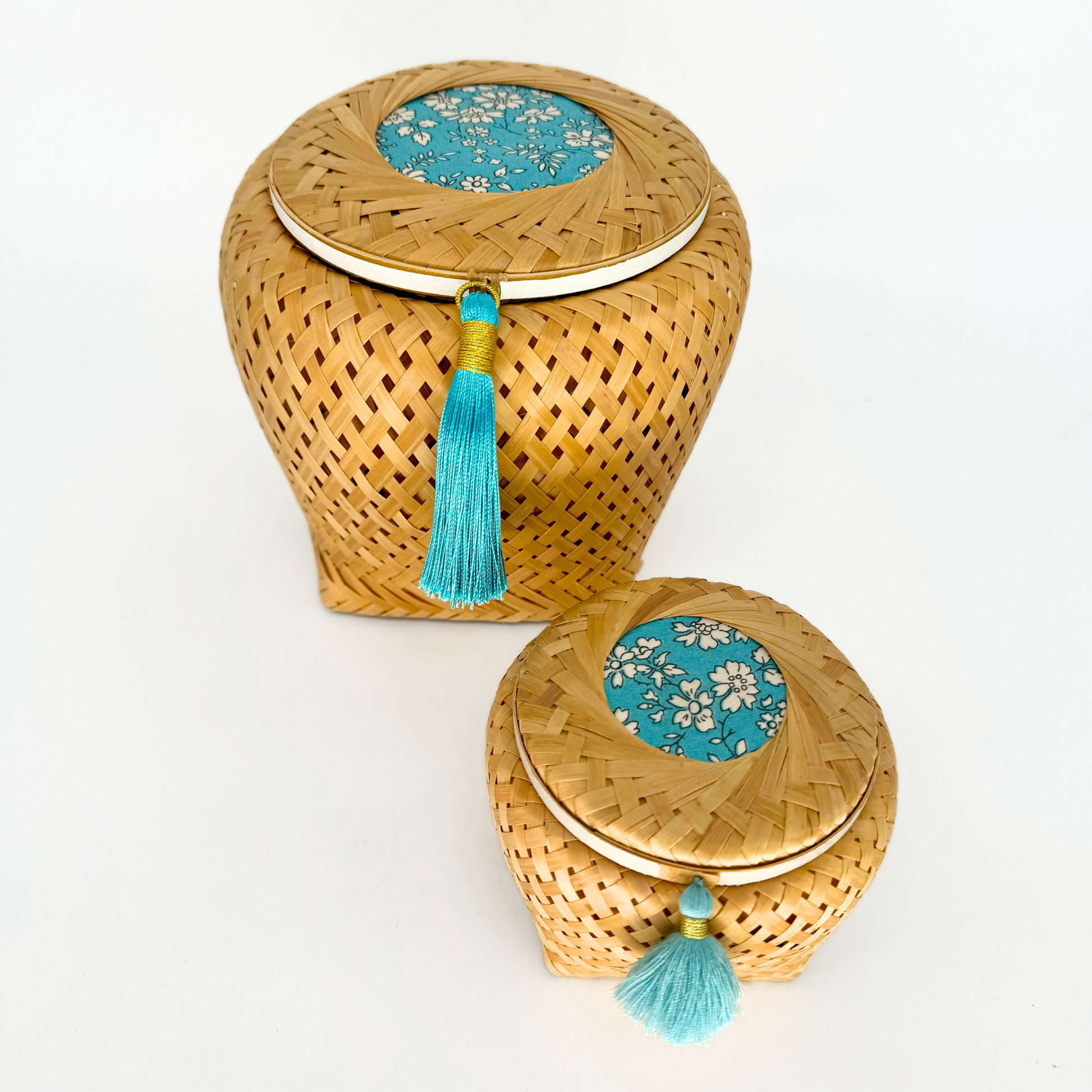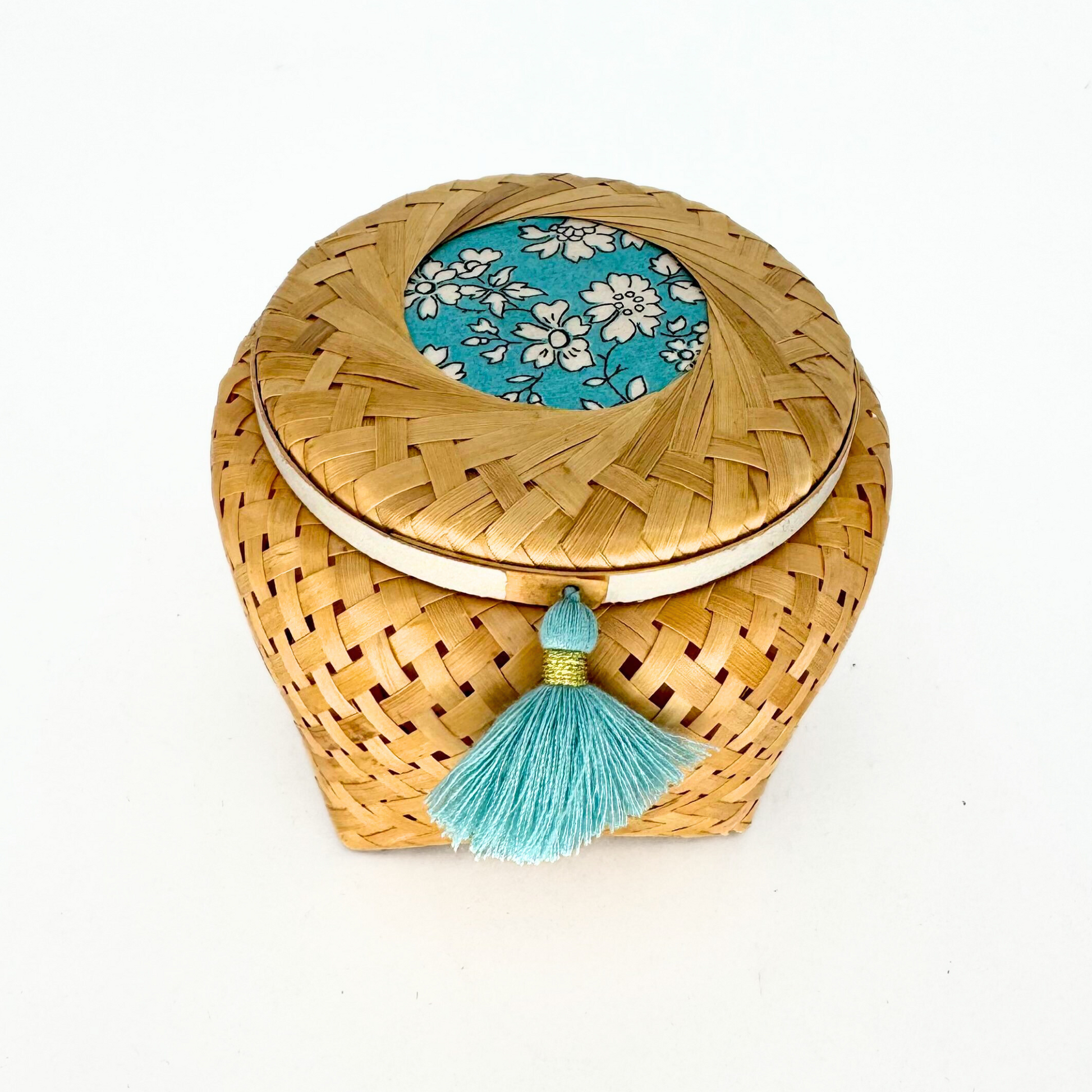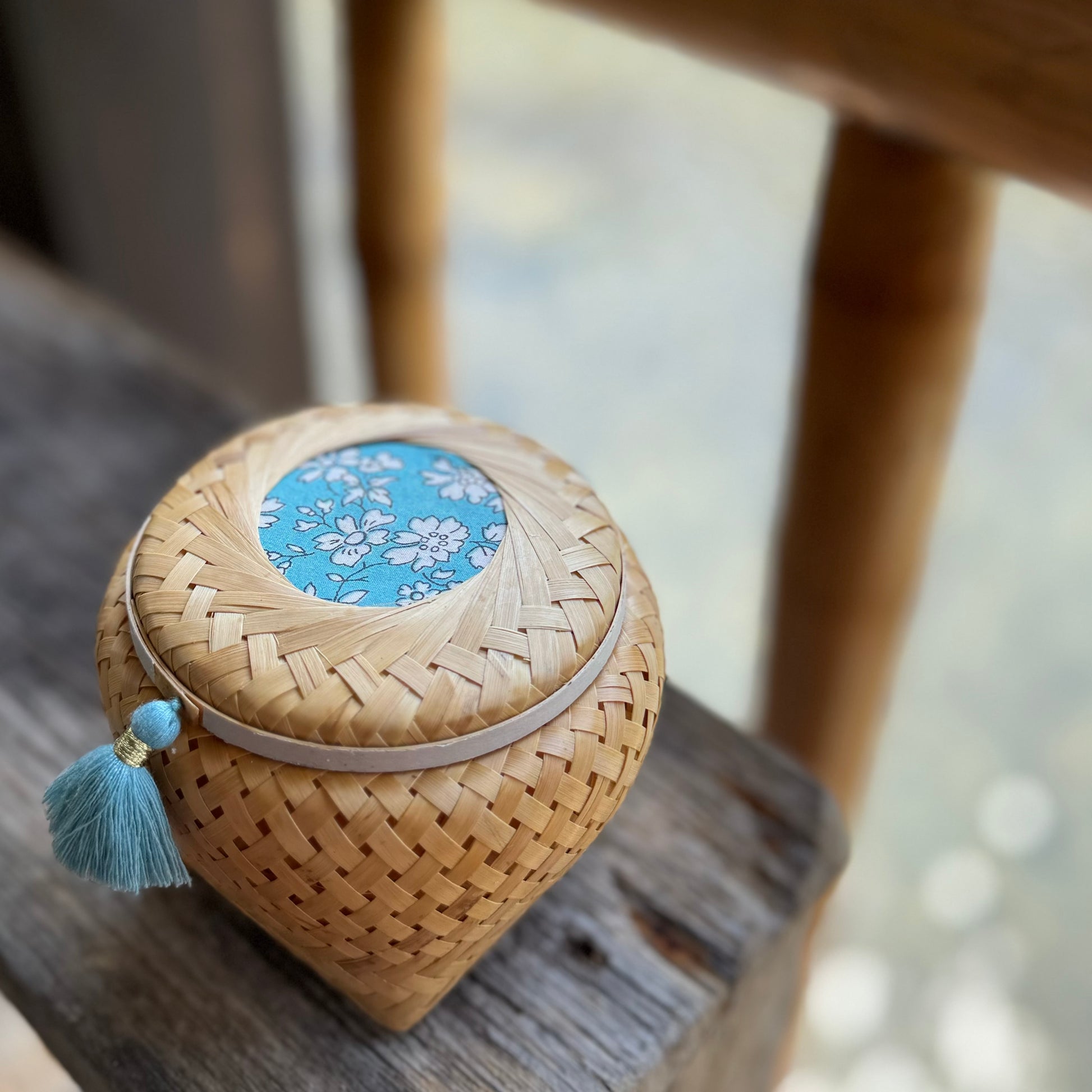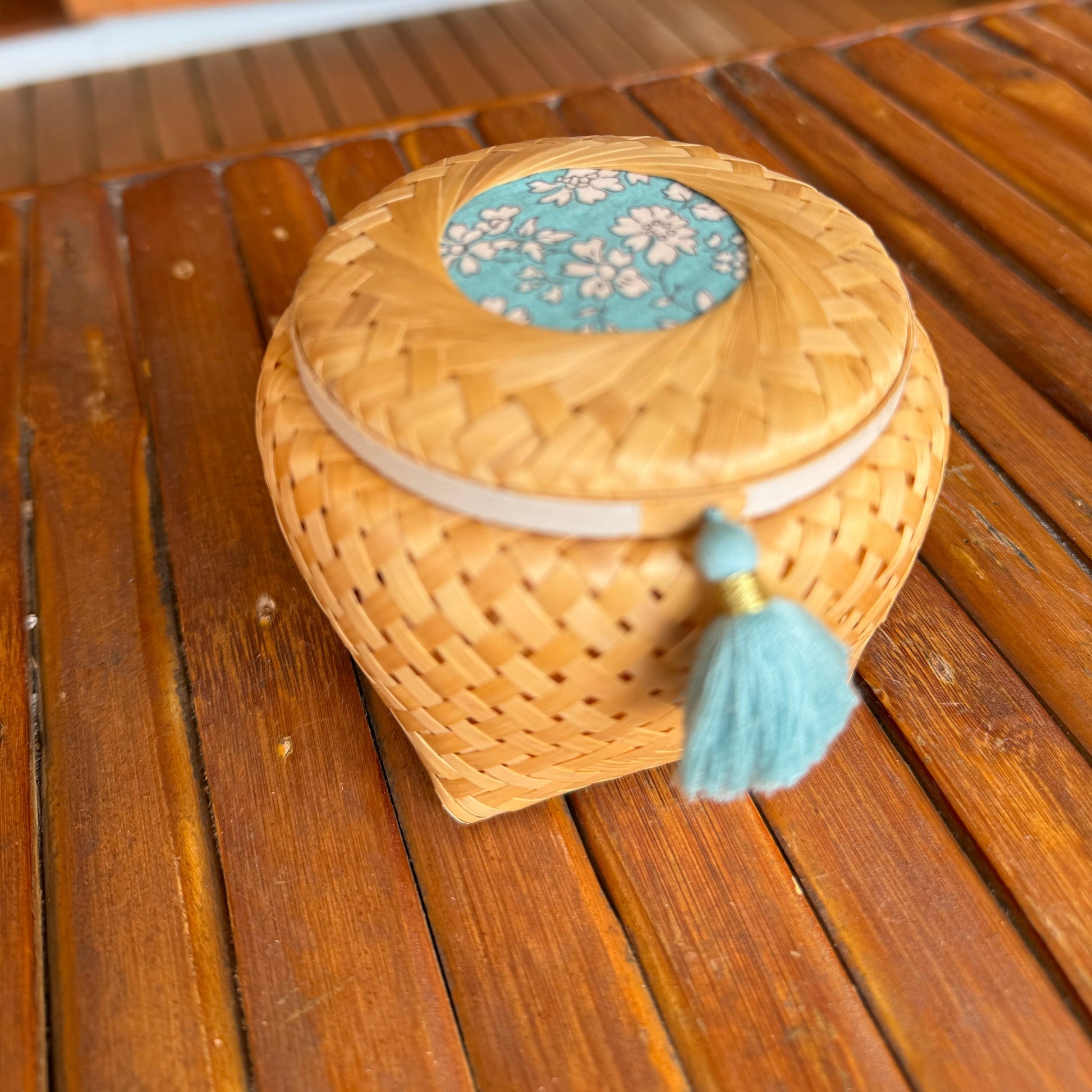 A modern twist on traditional Asian weaving, this bamboo basket features a square base and a softly rounded lid, creating a graceful silhouette. It’s adorned with a delicate fabric, a matching tassel, and decorative washi tape — each element carefully chosen to complement the basket’s natural tones and add a touch of charm. Its natural texture brings warmth, while the compact size makes it perfect for storing lipsticks, hair clips, or other small essentials.