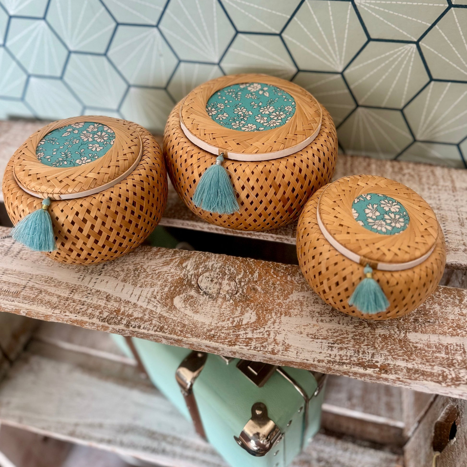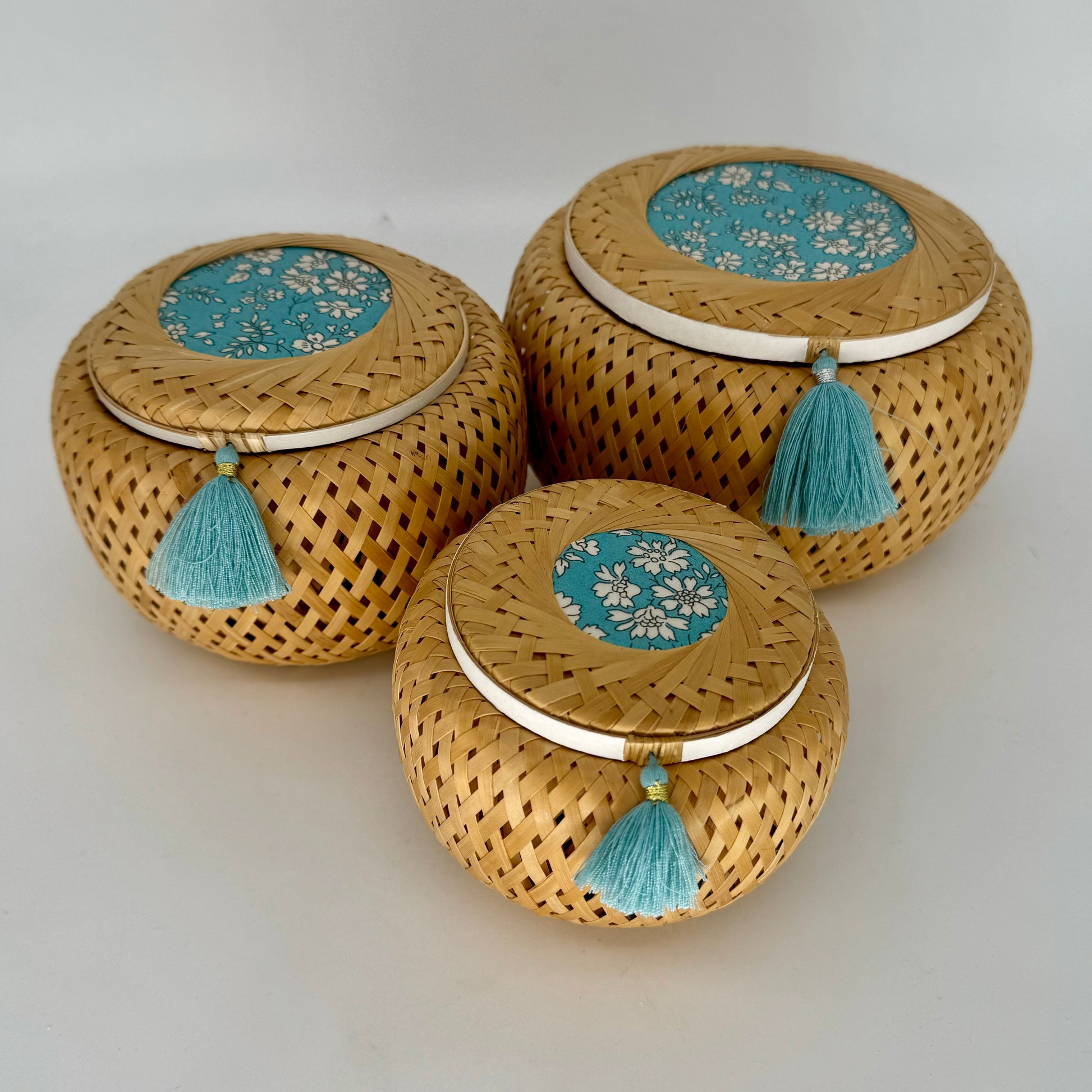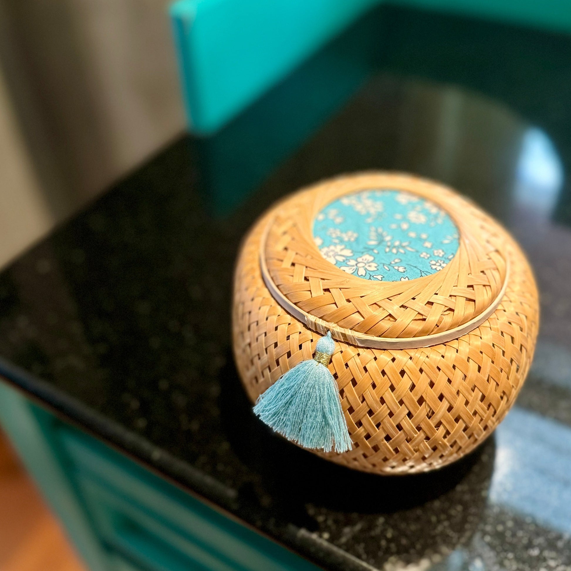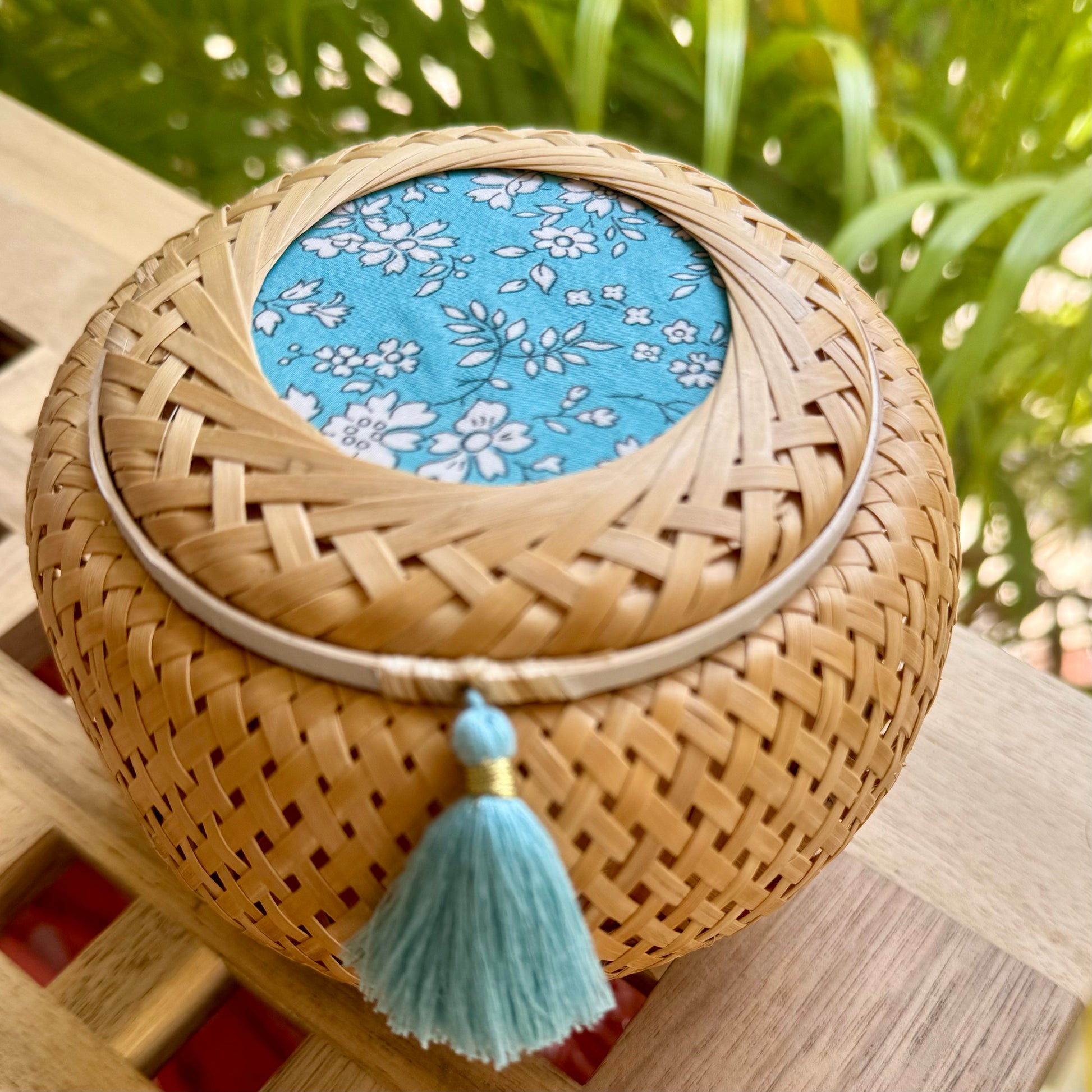Blending heritage craftsmanship with modern understated elegance, this round-shaped basket features intricate weaving, coordinated fabric accents, washi tape, and a matching tassel. It brings a sense of calm and beauty to any space. Its pratical shape is perfect for holding things like skincare samples, jewelry pieces, small candles, or washi tape collections.