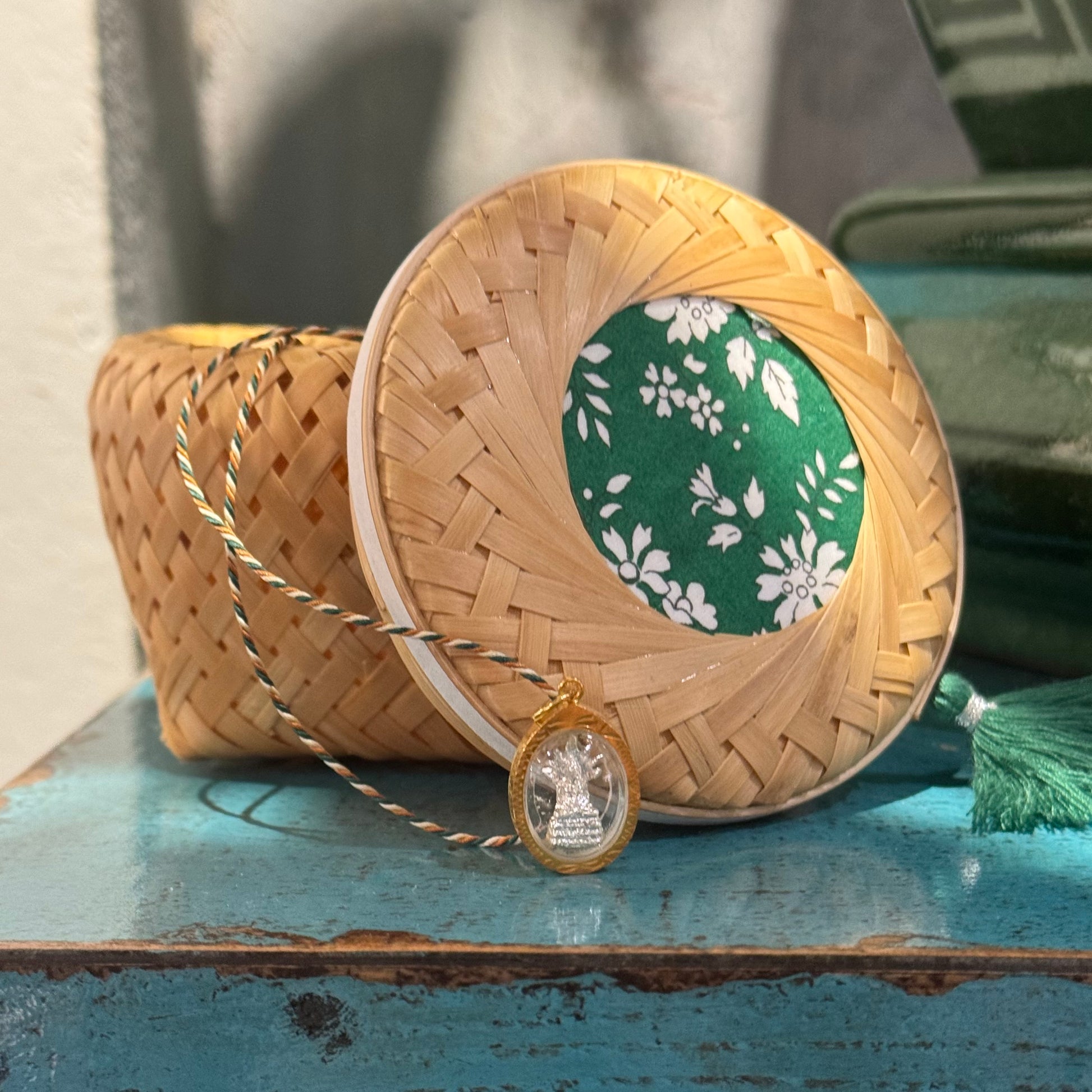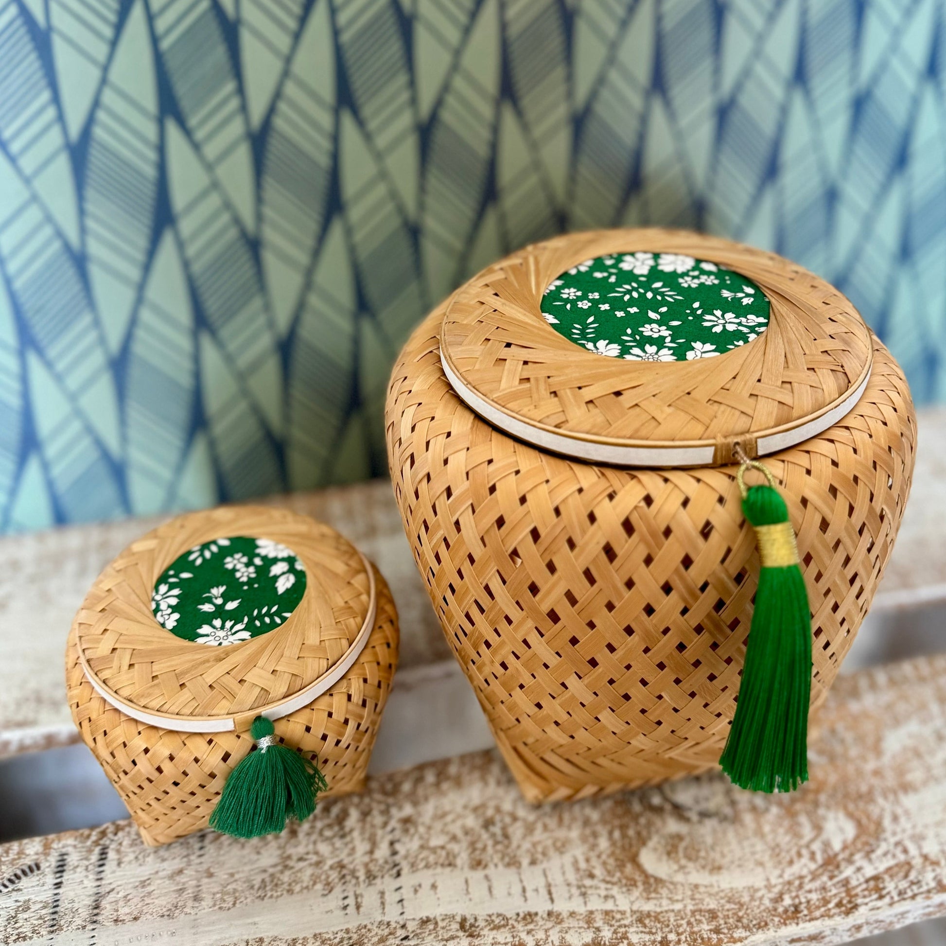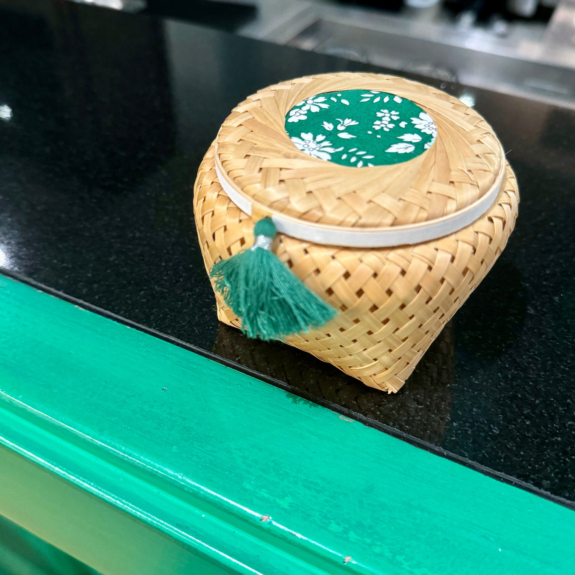 A modern twist on traditional Asian weaving, this bamboo basket features a square base and a softly rounded lid, creating a graceful silhouette. It’s adorned with a delicate fabric, a matching tassel, and decorative washi tape — each element carefully chosen to complement the basket’s natural tones and add a touch of charm. Its natural texture brings warmth, while the compact size makes it perfect for storing lipsticks, hair clips, or other small essentials.