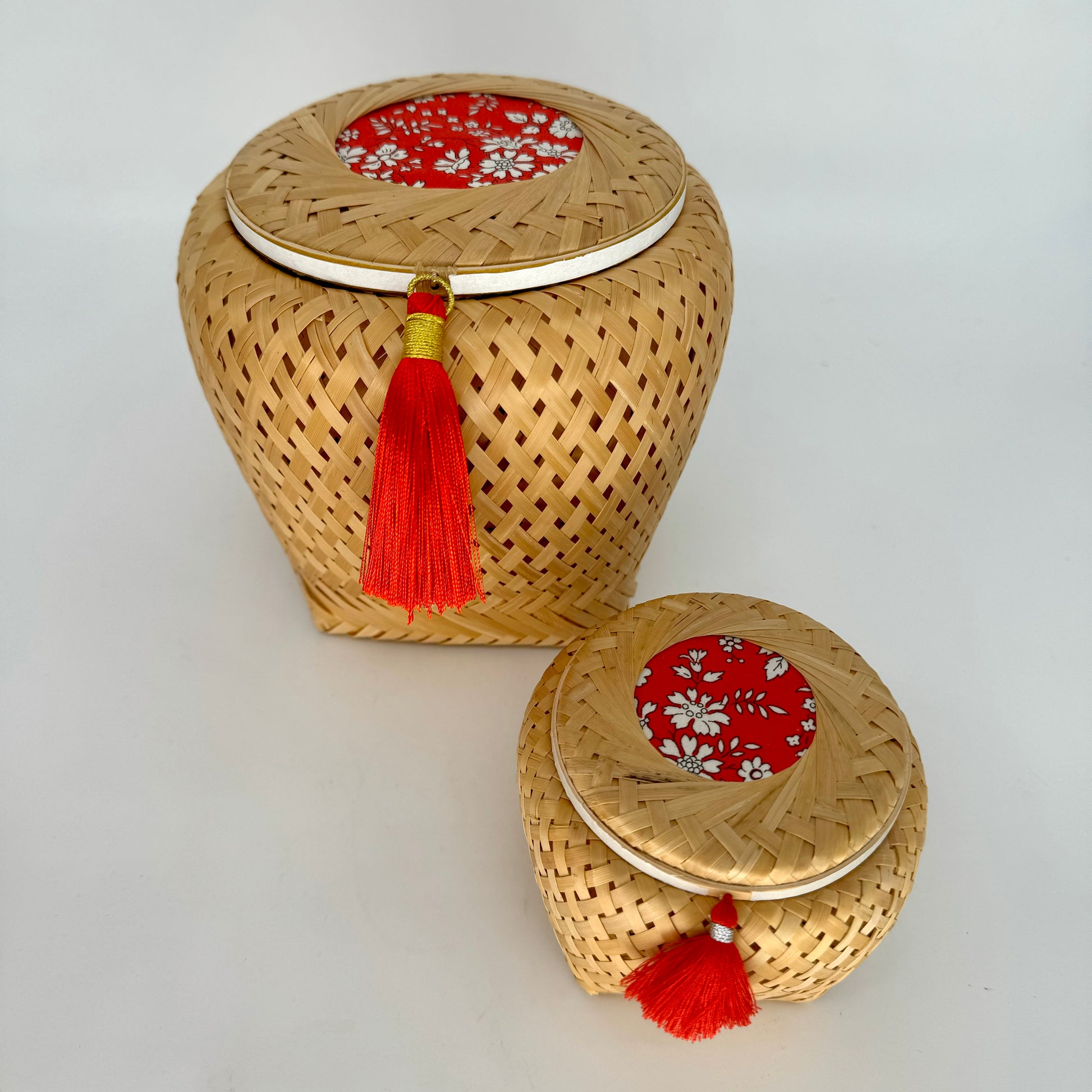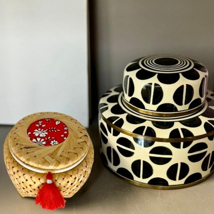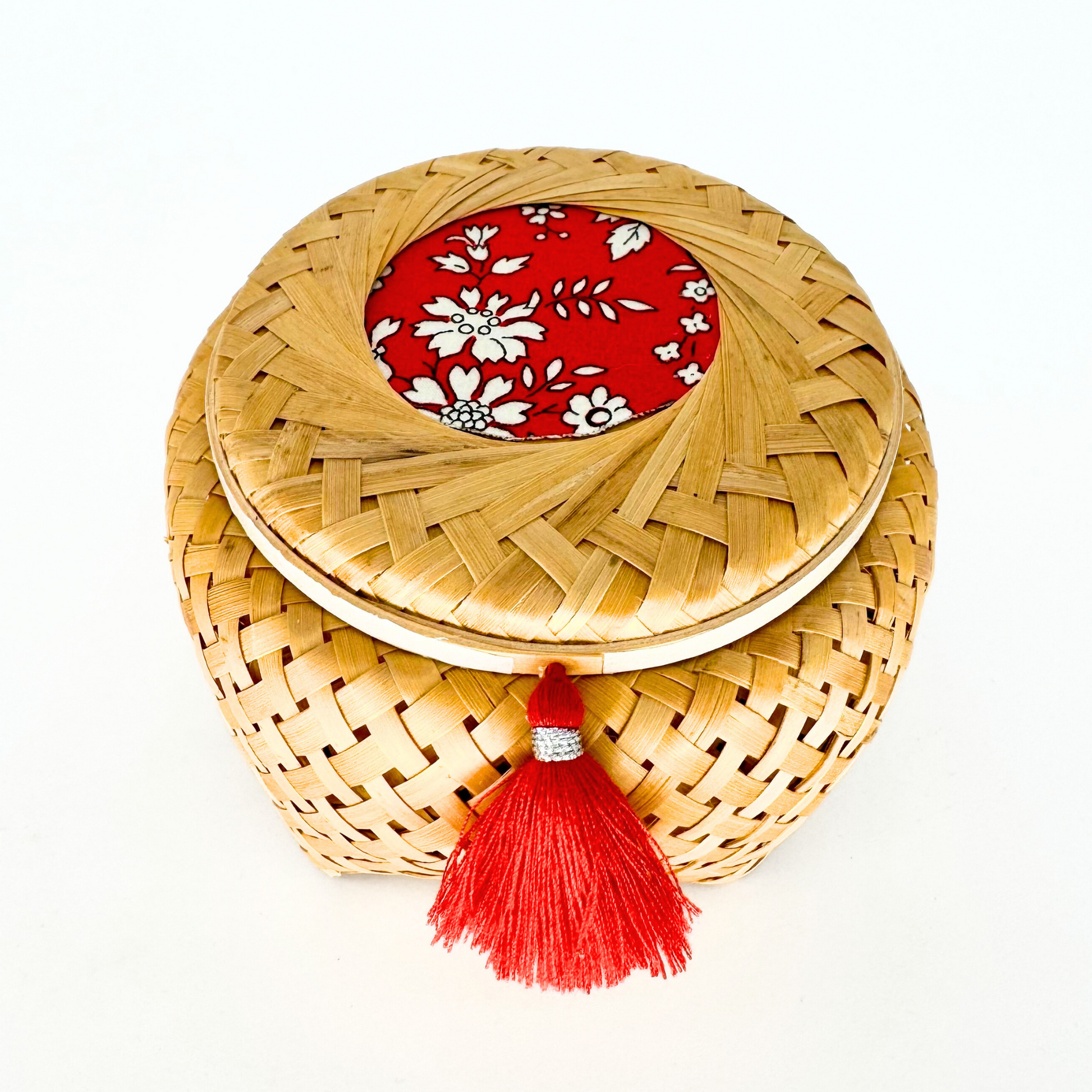 A modern twist on traditional Asian weaving, this bamboo basket features a square base and a softly rounded lid, creating a graceful silhouette. It’s adorned with a delicate fabric, a matching tassel, and decorative washi tape — each element carefully chosen to complement the basket’s natural tones and add a touch of charm. Its natural texture brings warmth, while the compact size makes it perfect for storing lipsticks, hair clips, or other small essentials.