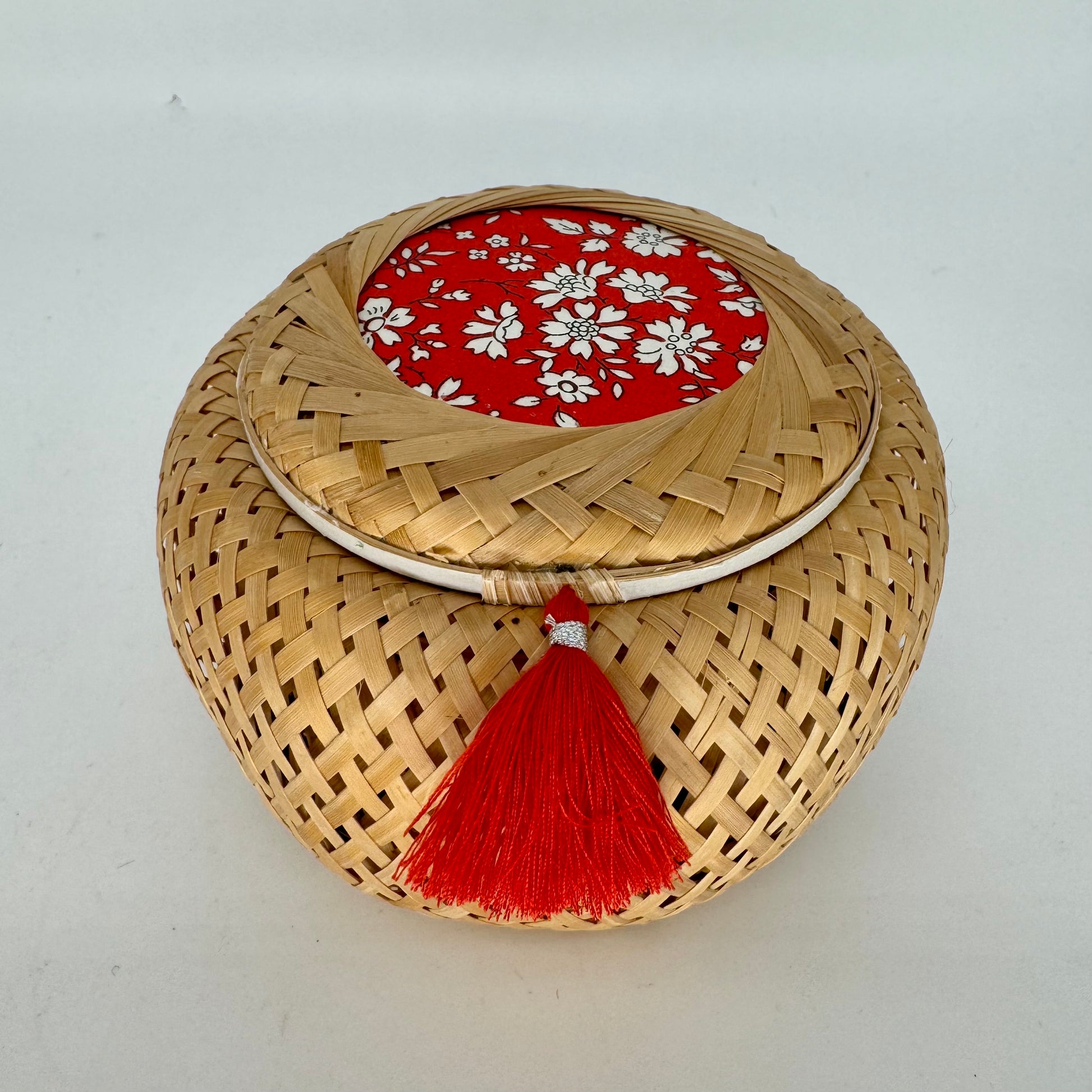 Blending heritage craftsmanship with modern understated elegance, this round-shaped basket features intricate weaving, coordinated fabric accents, washi tape, and a matching tassel. It brings a sense of calm and beauty to any space. Its pratical shape is perfect for holding things like skincare samples, jewelry pieces, small candles, or washi tape collections.