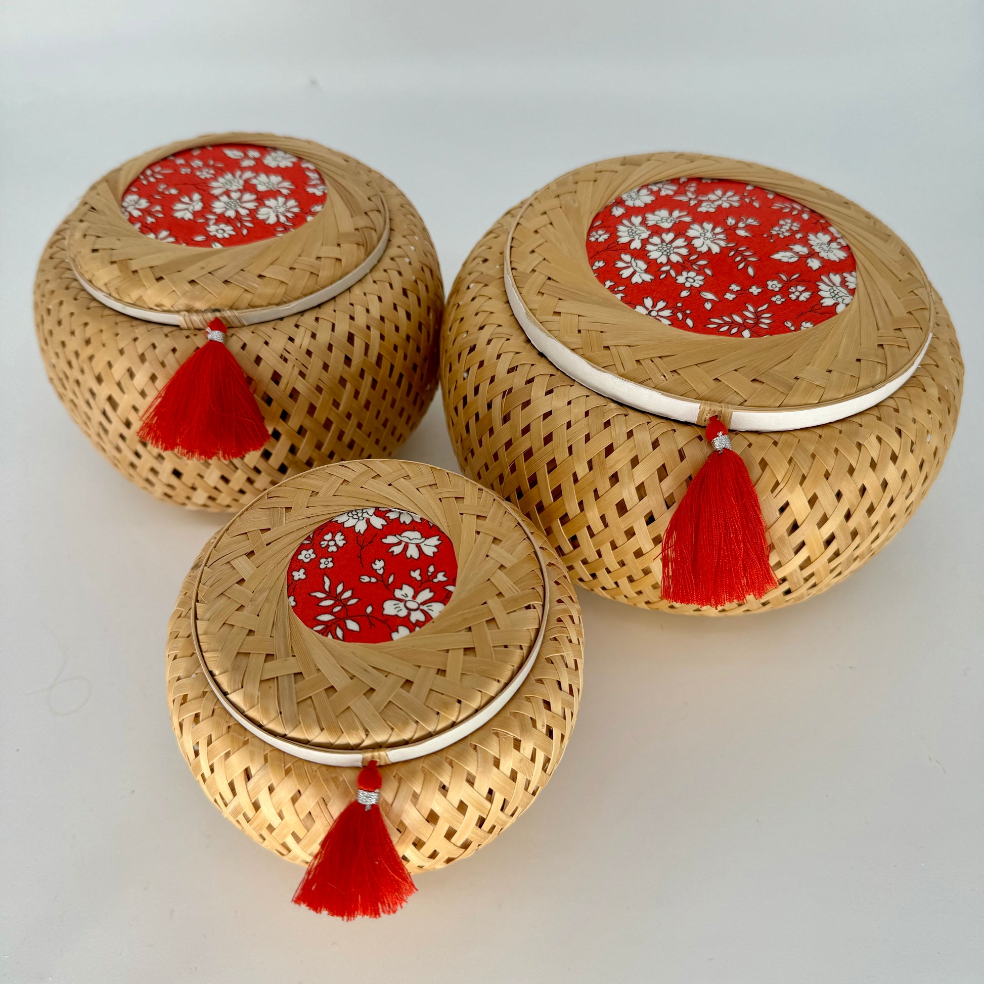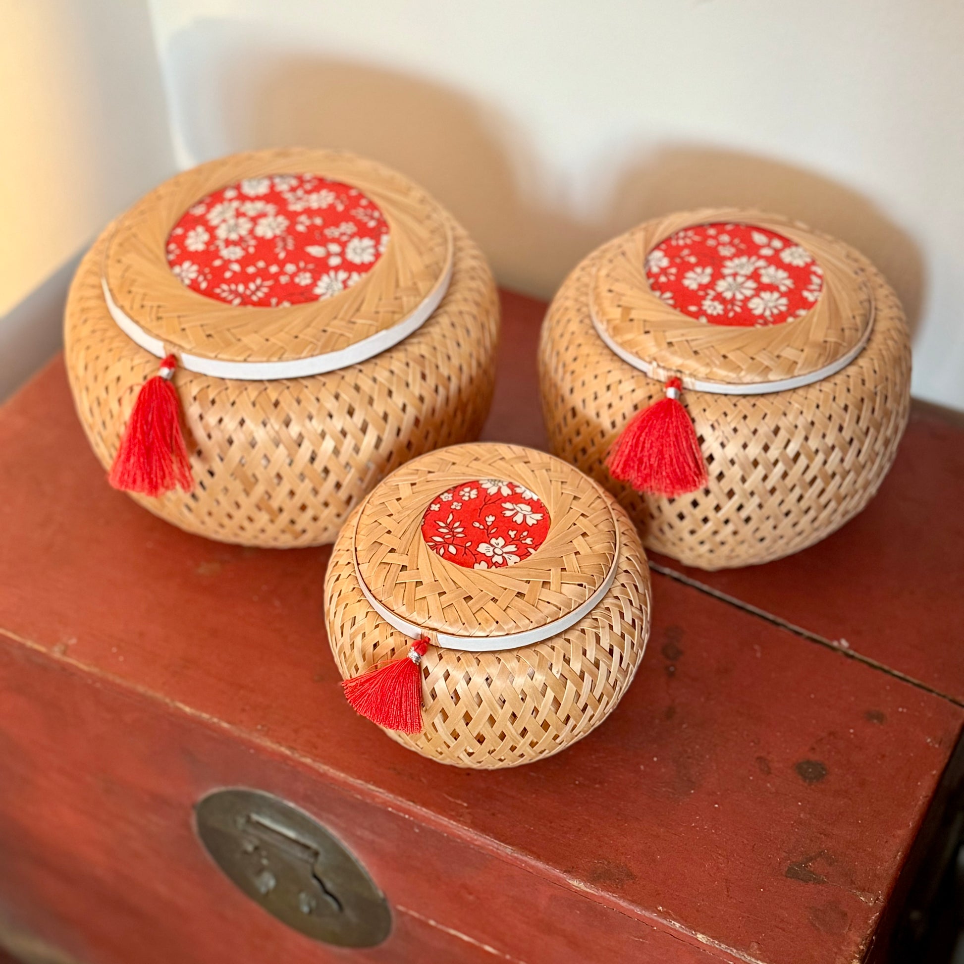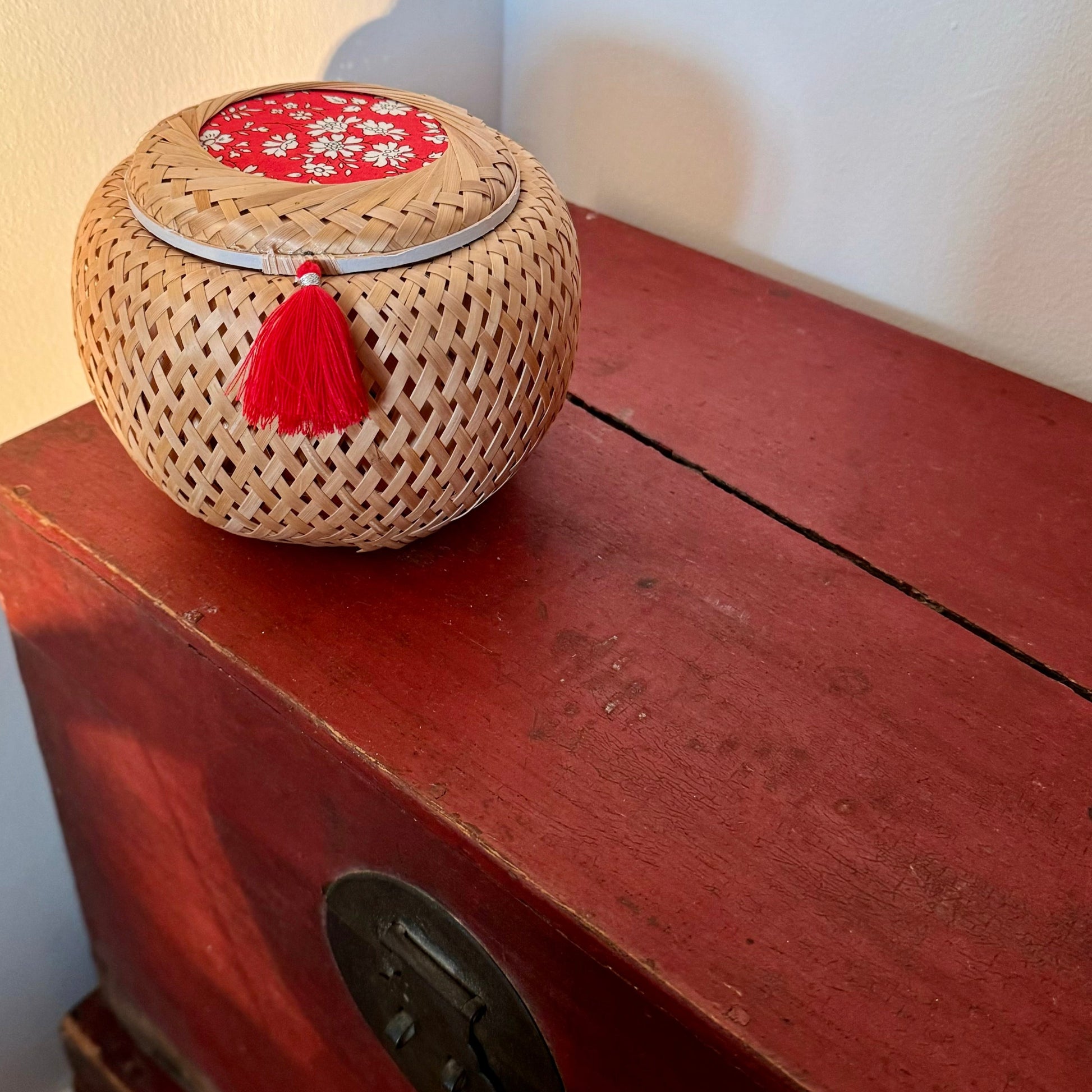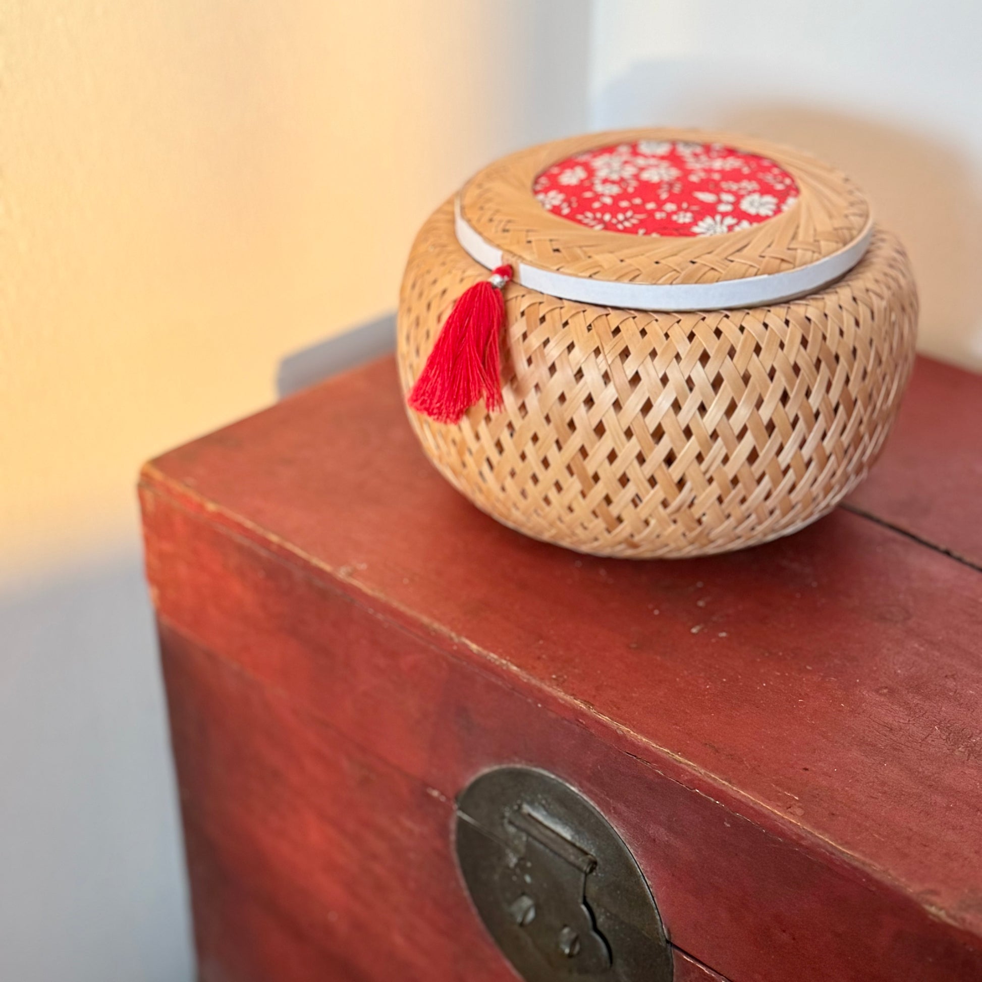 Blending heritage craftsmanship with modern understated elegance, this round-shaped basket features intricate weaving, coordinated fabric accents, washi tape, and a matching tassel. It brings a sense of calm and beauty to any space. Its versatile form is perfect for storing everyday essentials, from hair ties and cotton pads to tea bags or coffee capsules.