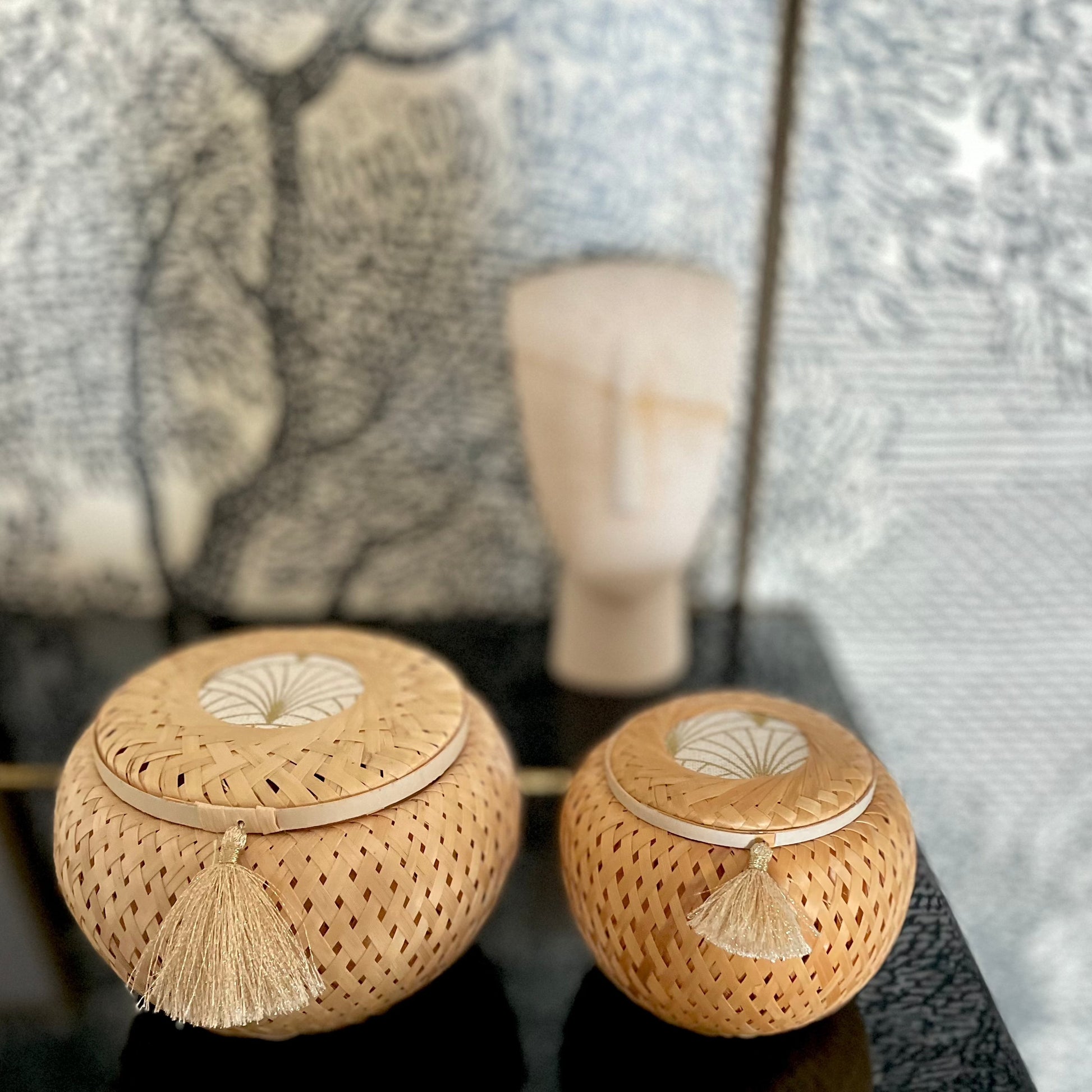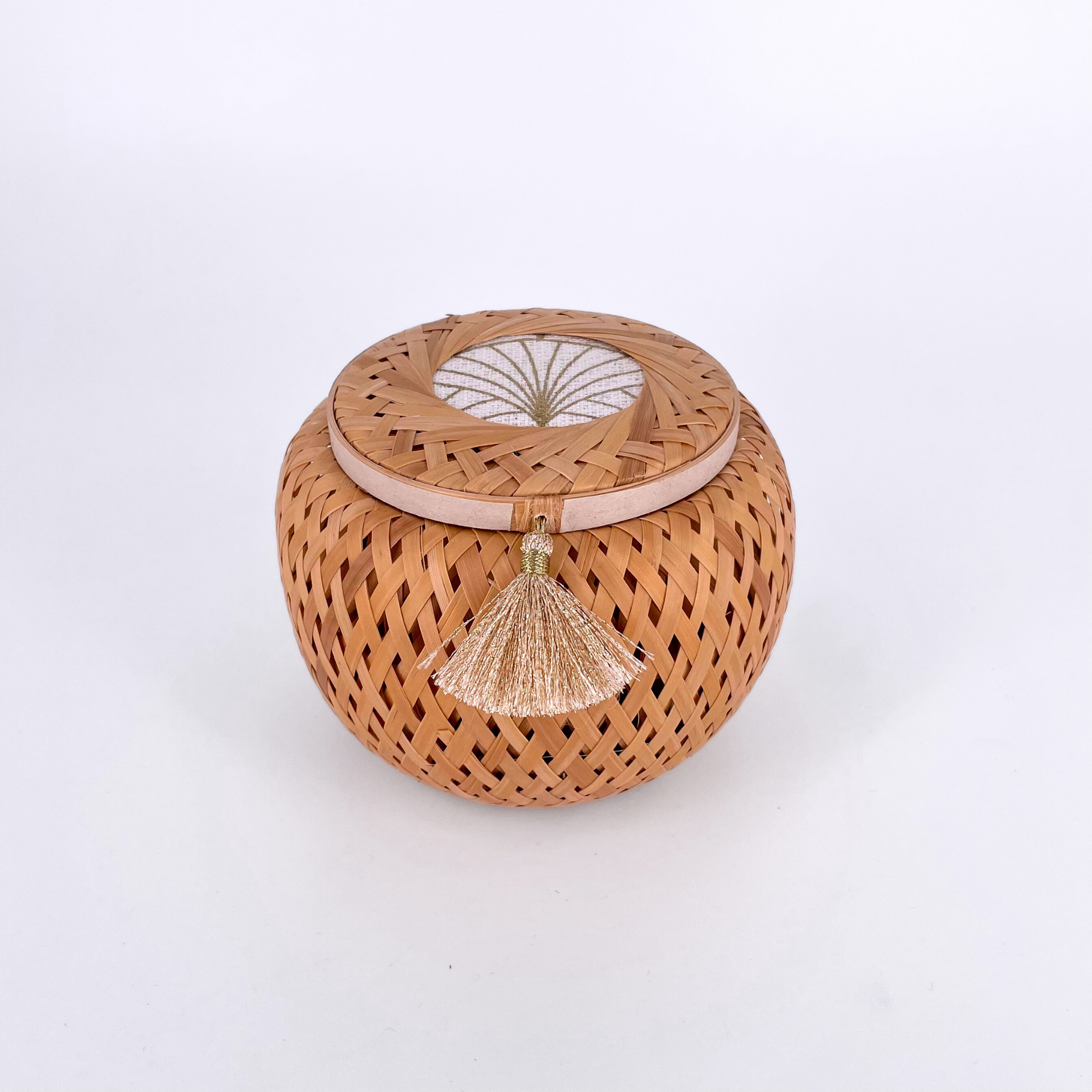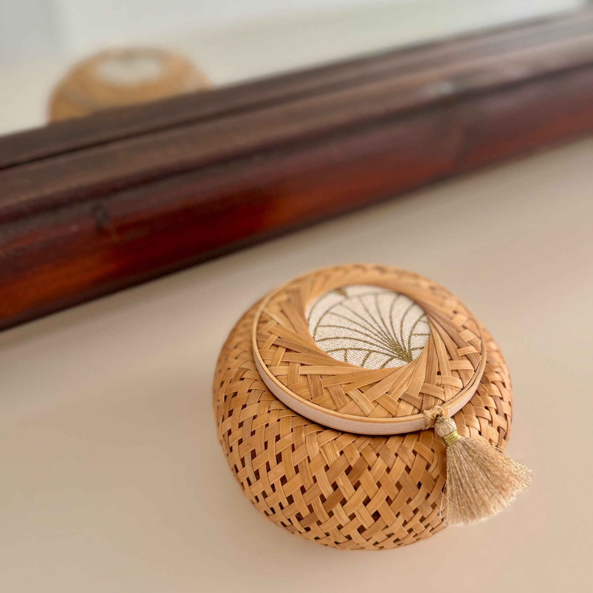Blending heritage craftsmanship with modern understated elegance, this round-shaped basket features intricate weaving, coordinated fabric accents, washi tape, and a matching tassel. It brings a sense of calm and beauty to any space. Its versatile form is perfect for storing everyday essentials, from hair ties and cotton pads to tea bags or coffee capsules.