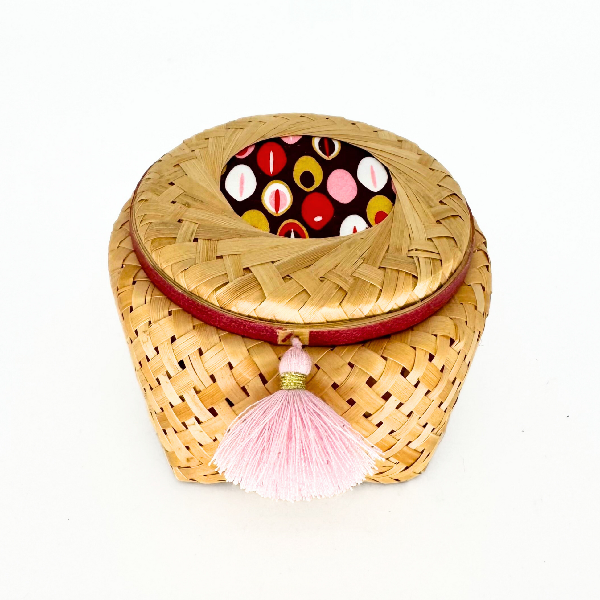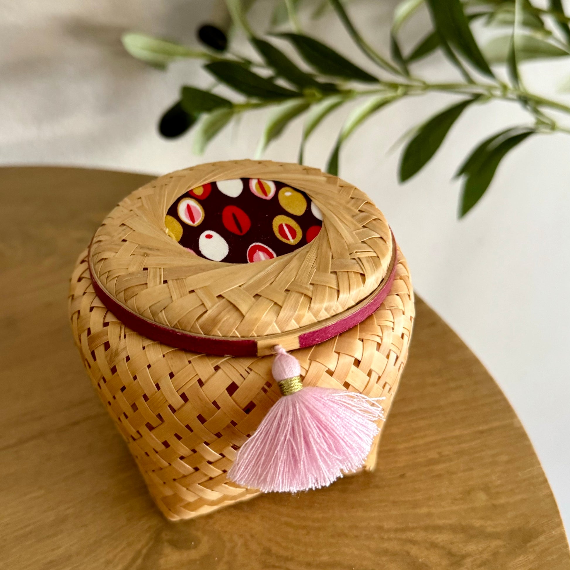 A modern twist on traditional Asian weaving, this bamboo basket features a square base and a softly rounded lid, creating a graceful silhouette. It’s adorned with a delicate fabric, a matching tassel, and decorative washi tape — each element carefully chosen to complement the basket’s natural tones and add a touch of charm. Its natural texture brings warmth, while the compact size makes it perfect for storing lipsticks, hair clips, or other small essentials.