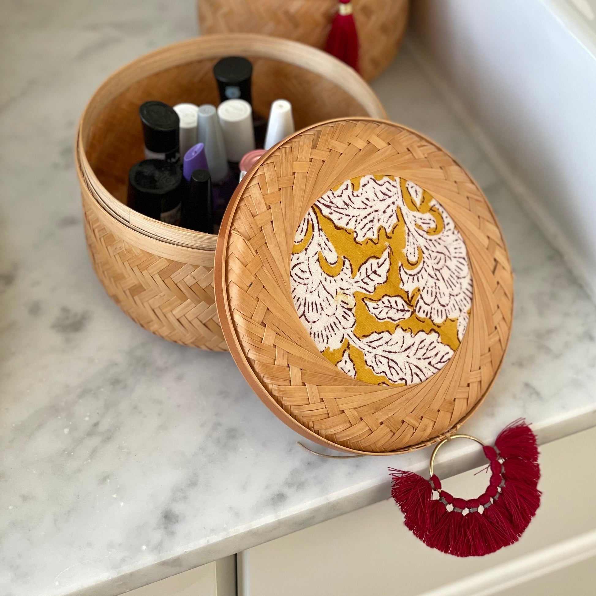 This cylindrical bamboo basket combines natural texture with modern style, elevated by a unique & charming tassel. Just the right size for essential oils or wrapped snacks, it keeps your essentials organized while adding a refined touch to your space.