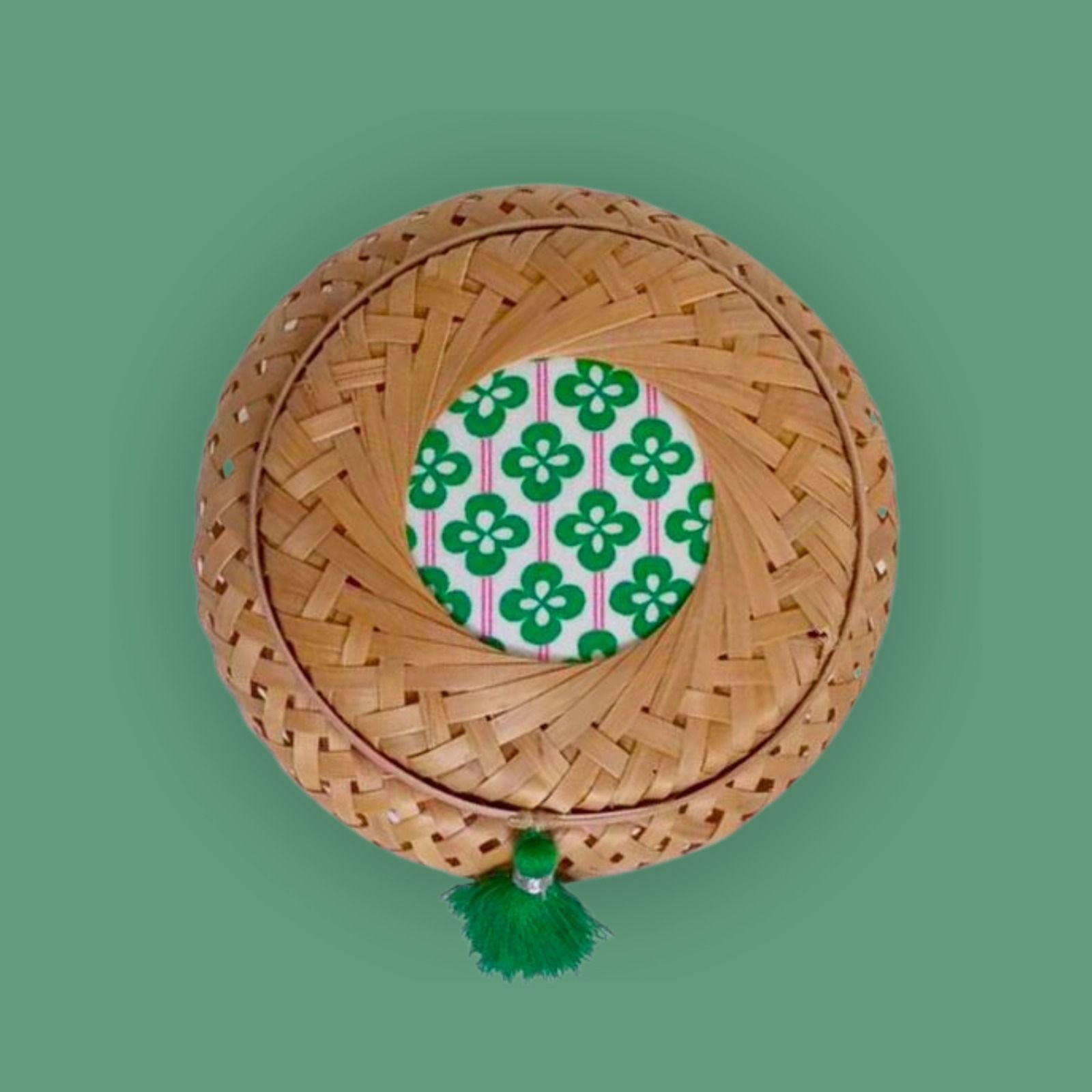 A modern twist on traditional Asian weaving, this bamboo basket features a square base and a softly rounded lid, creating a graceful silhouette. It’s adorned with a delicate fabric, a matching tassel, and decorative washi tape — each element carefully chosen to complement the basket’s natural tones and add a touch of charm. Its natural texture brings warmth, while the compact size makes it perfect for storing lipsticks, hair clips, or other small essentials.