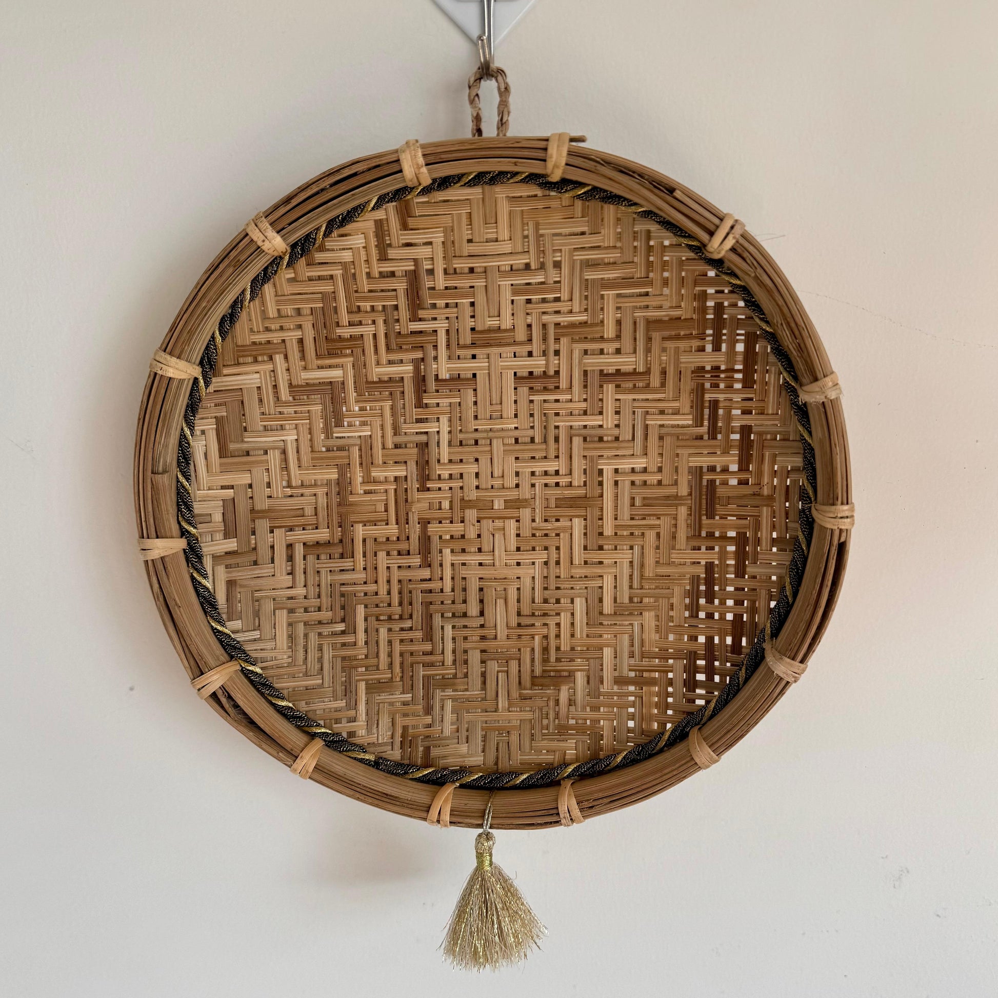 This bamboo tray is transformed into an elegant earring holder, with an open weave ideal for displaying jewelry. Delicate ribbon and tassel details complete the look.