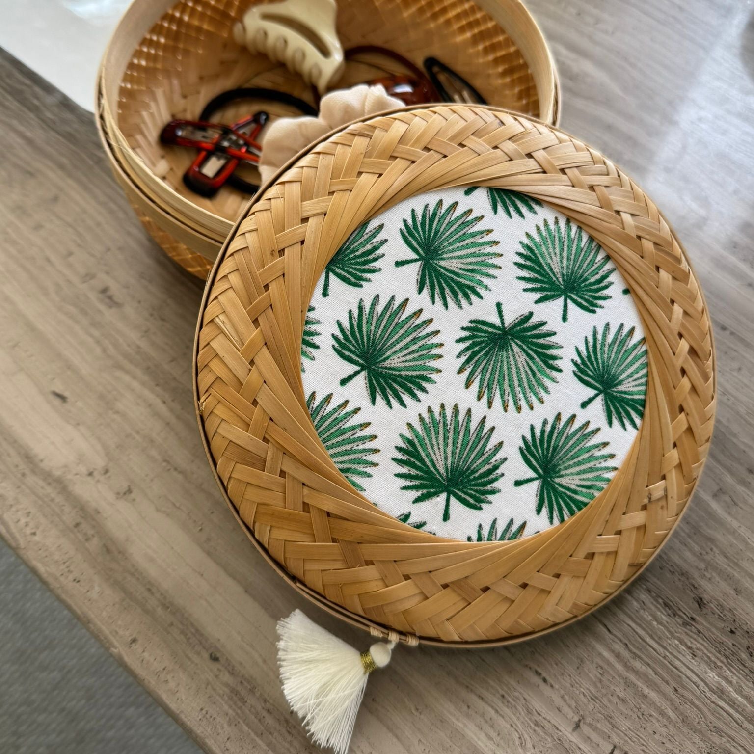 With its flat shape, this short basket makes it easy to spot and grab small items — whether jewelry like bracelets and earrings or desk essentials like paper clips and pins. The fabric-covered lid, tassel and matching washi tape, and tassel add a charming decorative touch.