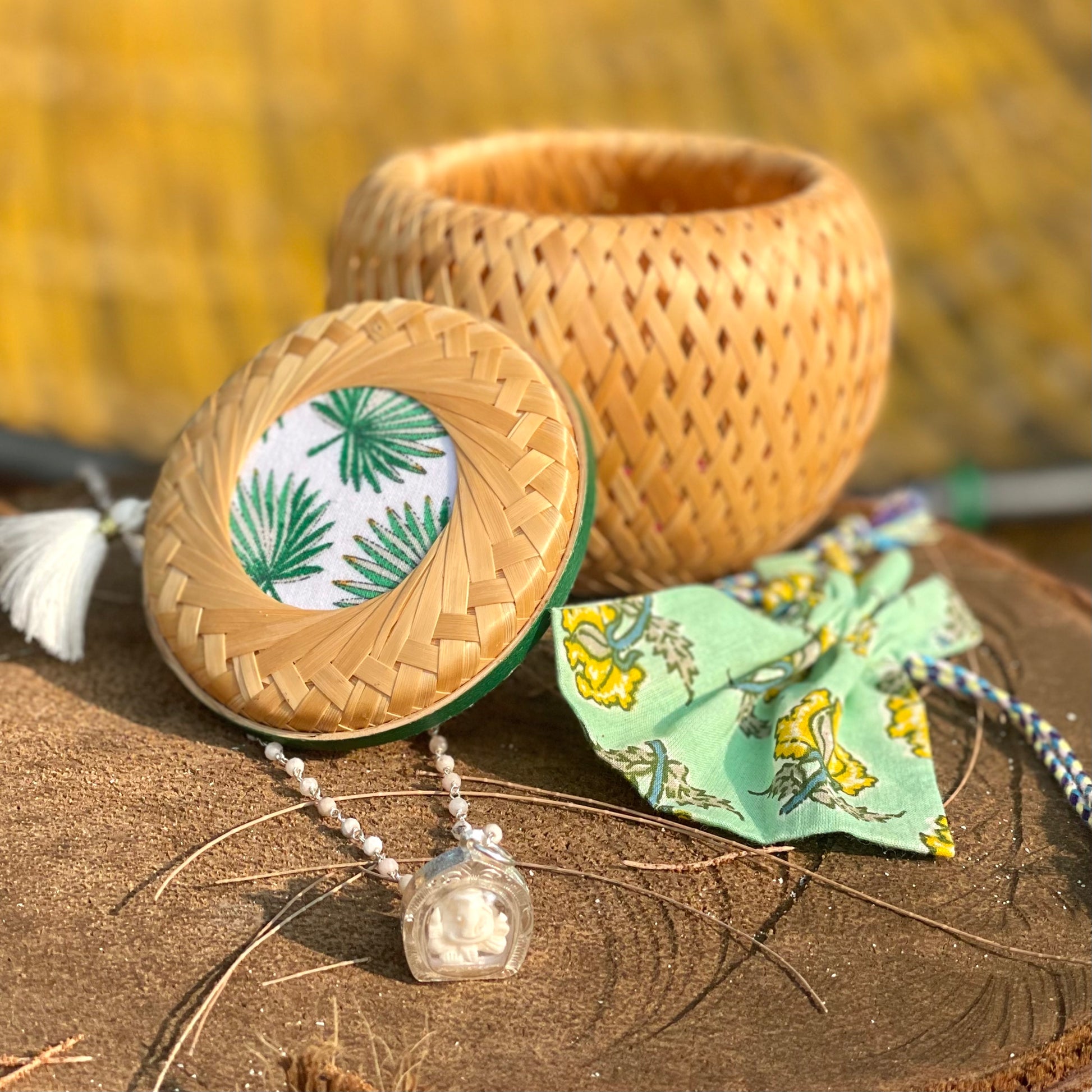 Blending heritage craftsmanship with modern understated elegance, this round-shaped basket features intricate weaving, coordinated fabric accents, washi tape, and a matching tassel. It brings a sense of calm and beauty to any space. Its versatile form is perfect for storing everyday essentials, from hair ties and cotton pads to tea bags or coffee capsules.