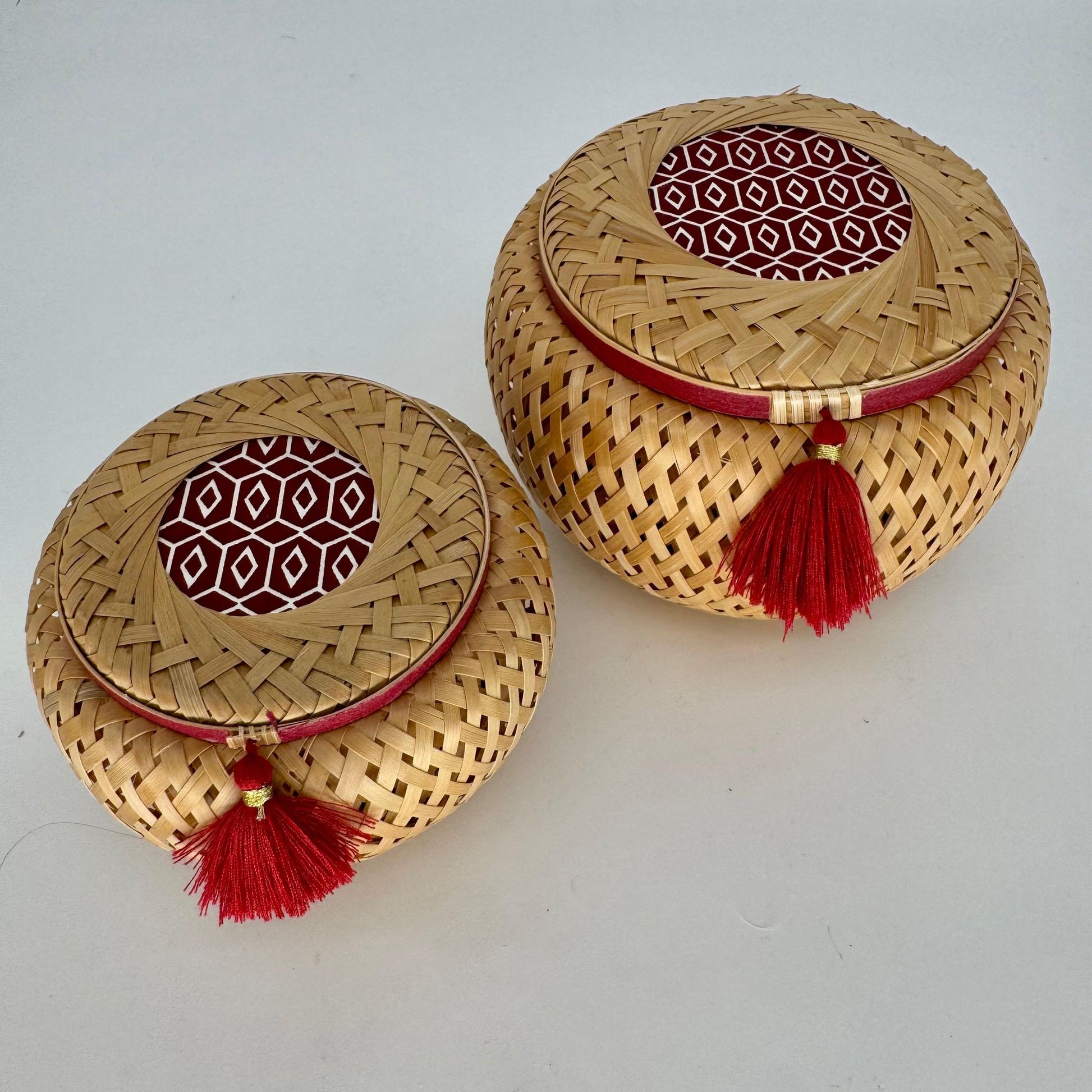 Blending heritage craftsmanship with modern understated elegance, this round-shaped basket features intricate weaving, coordinated fabric accents, washi tape, and a matching tassel. It brings a sense of calm and beauty to any space. Its versatile form is perfect for storing everyday essentials, from hair ties and cotton pads to tea bags or coffee capsules.