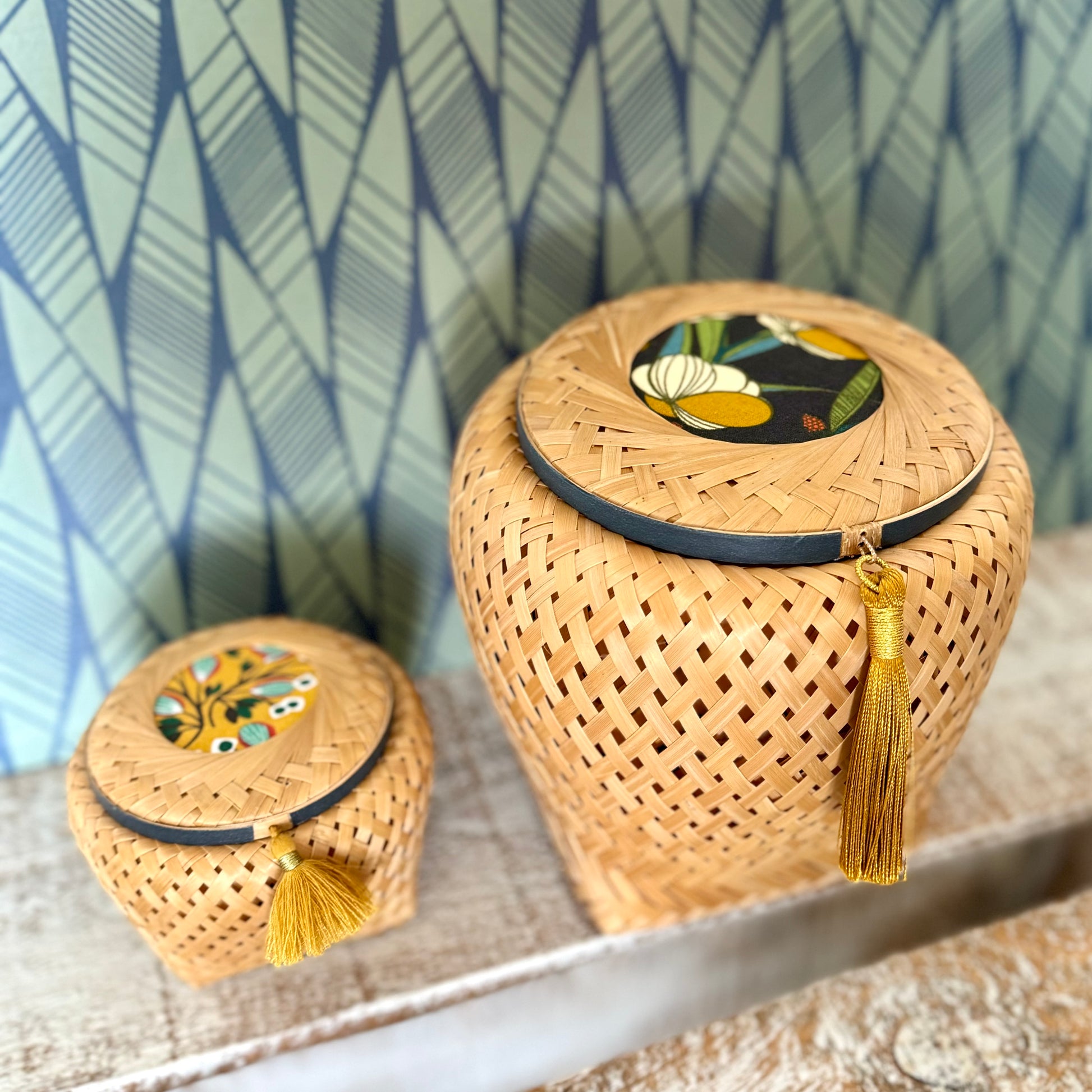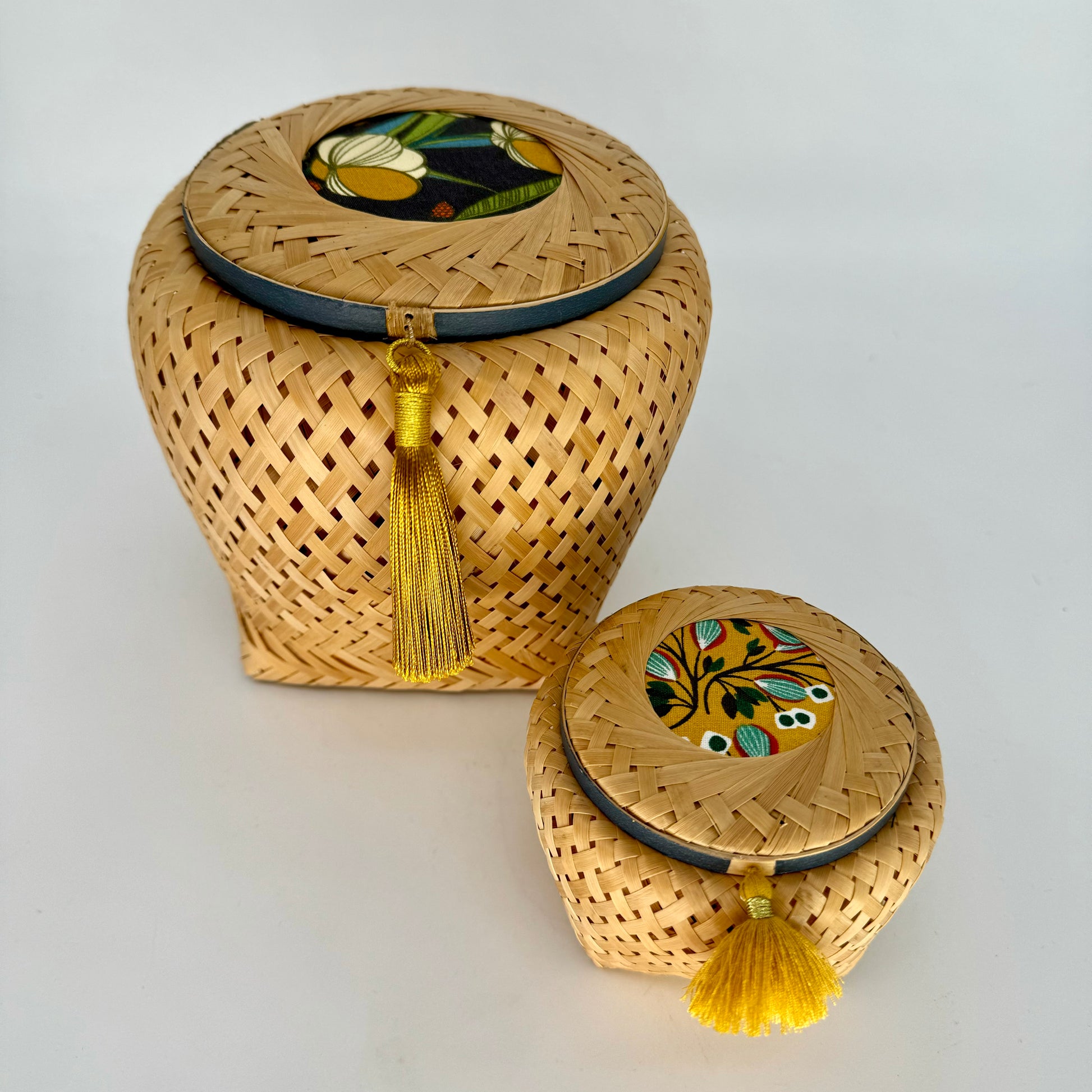 A modern twist on traditional Asian weaving, this bamboo basket features a square base and a softly rounded lid, creating a graceful silhouette. It’s adorned with a delicate fabric, a matching tassel, and decorative washi tape — each element carefully chosen to complement the basket’s natural tones and add a touch of charm. Its natural texture brings warmth, while the compact size makes it perfect for storing lipsticks, hair clips, or other small essentials.