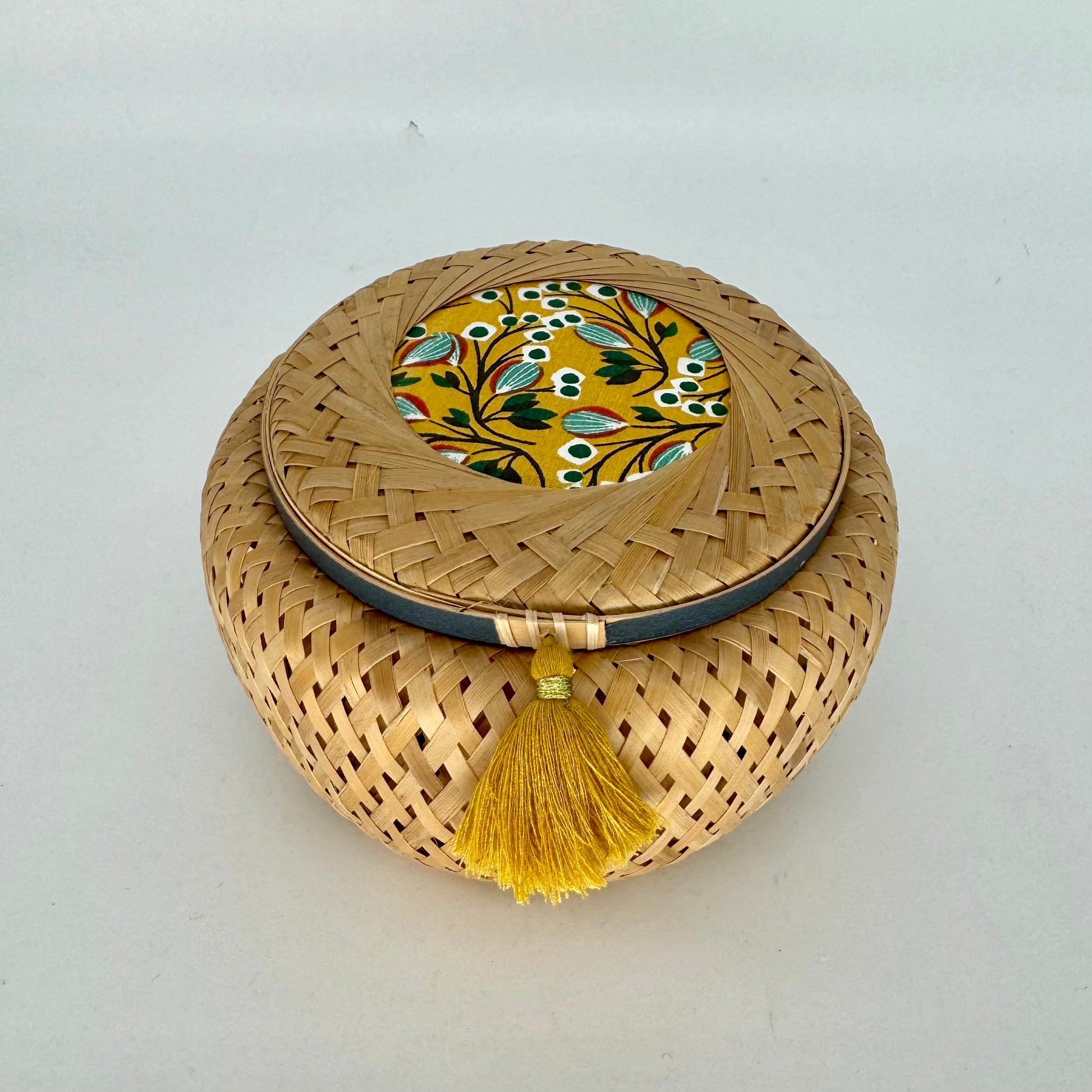 Blending heritage craftsmanship with modern understated elegance, this round-shaped basket features intricate weaving, coordinated fabric accents, washi tape, and a matching tassel. It brings a sense of calm and beauty to any space. Its pratical shape is perfect for holding things like skincare samples, jewelry pieces, small candles, or washi tape collections.