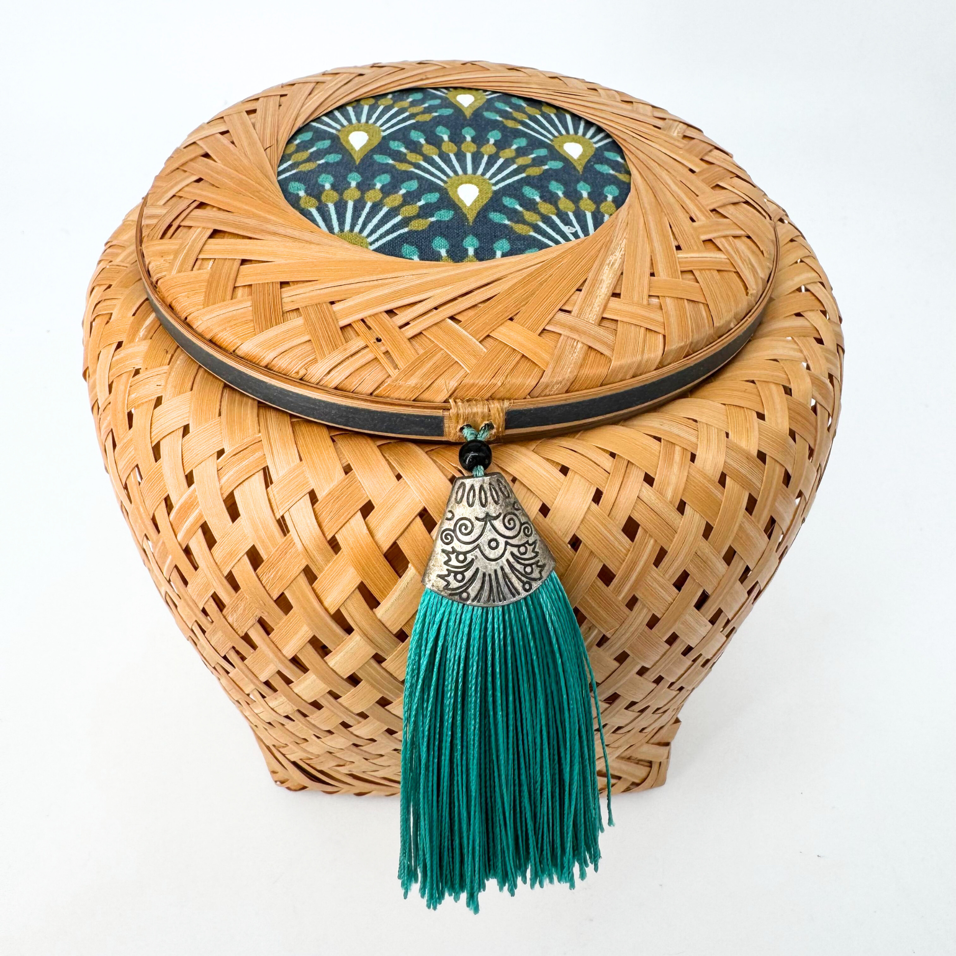 A modern twist on traditional Asian weaving, this bamboo basket features a square base and a softly rounded lid, creating a graceful silhouette. It’s adorned with a delicate fabric, a matching tassel, and decorative washi tape — each element carefully chosen to complement the basket’s natural tones and add a touch of charm. Its natural texture brings warmth, while the larger size makes it perfect for storing remote controls, wrapped snacks, or any essentials with style.