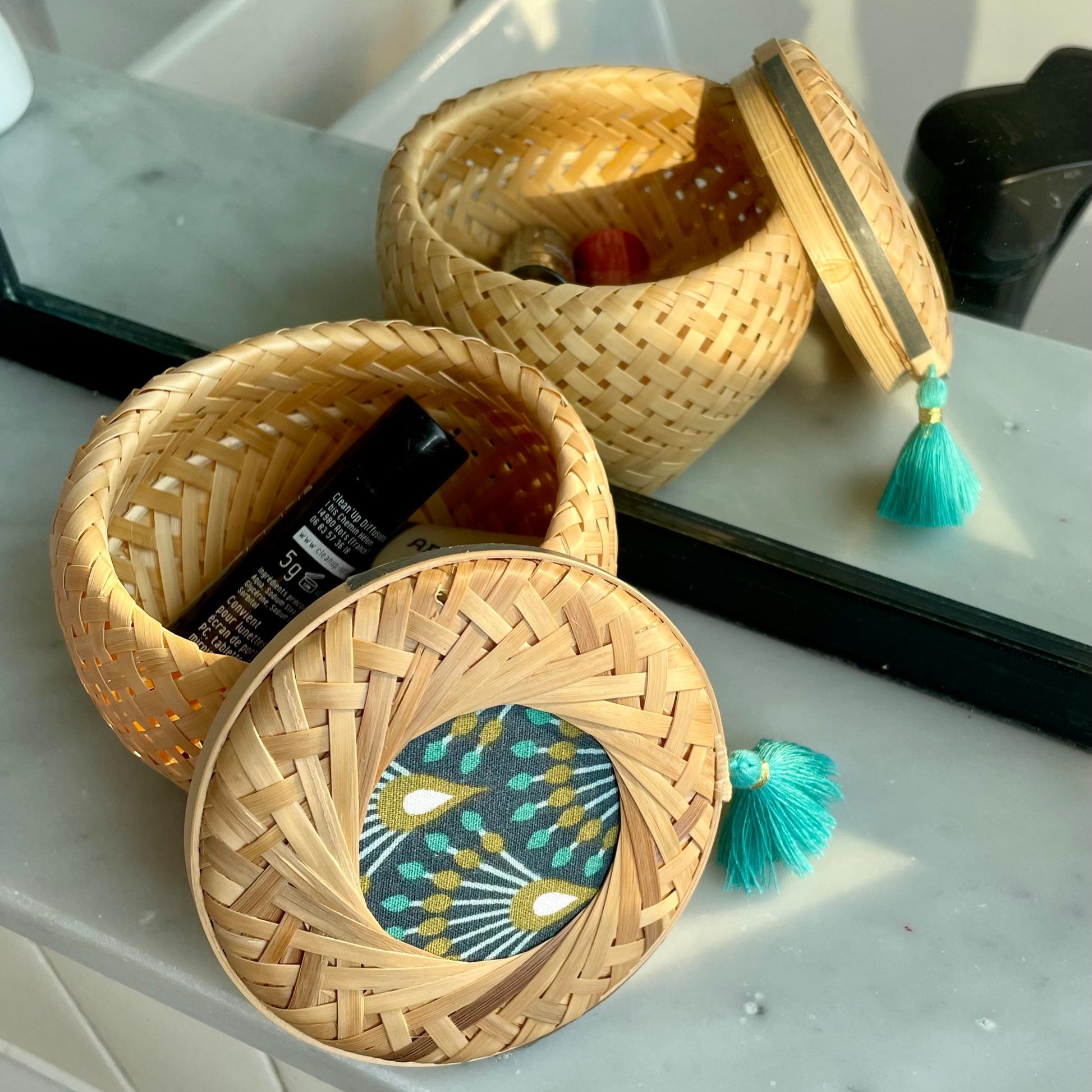 A modern twist on traditional Asian weaving, this bamboo basket features a square base and a softly rounded lid, creating a graceful silhouette. It’s adorned with a delicate fabric, a matching tassel, and decorative washi tape — each element carefully chosen to complement the basket’s natural tones and add a touch of charm. Its natural texture brings warmth, while the compact size makes it perfect for storing lipsticks, hair clips, or other small essentials.