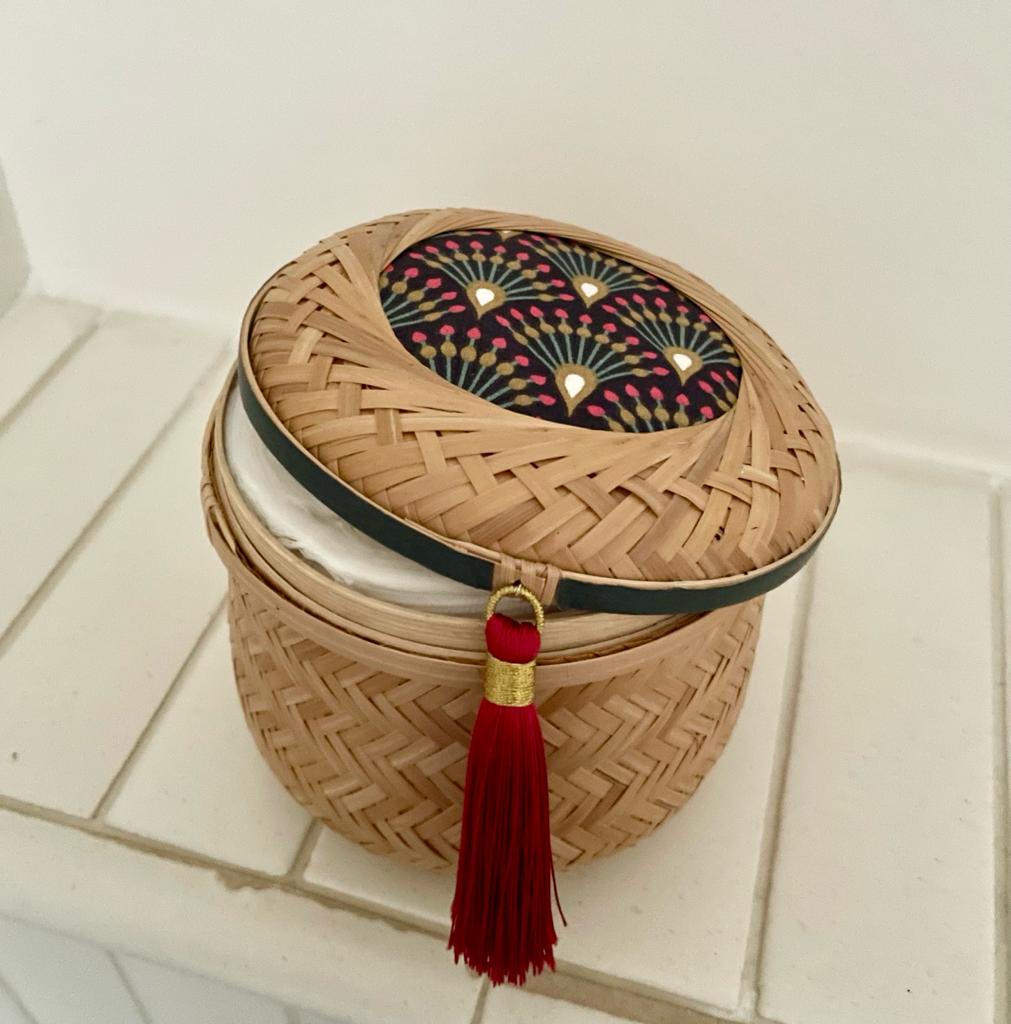 This long basket adds a gentle touch of elegance to everyday storage, with a slim silhouette that just right for holding a roll of toilet paper. Its lid features a thoughtfully coordinated fabric, washi tape, and soft tassel — together creating a delicate accent that warms and brightens any space.