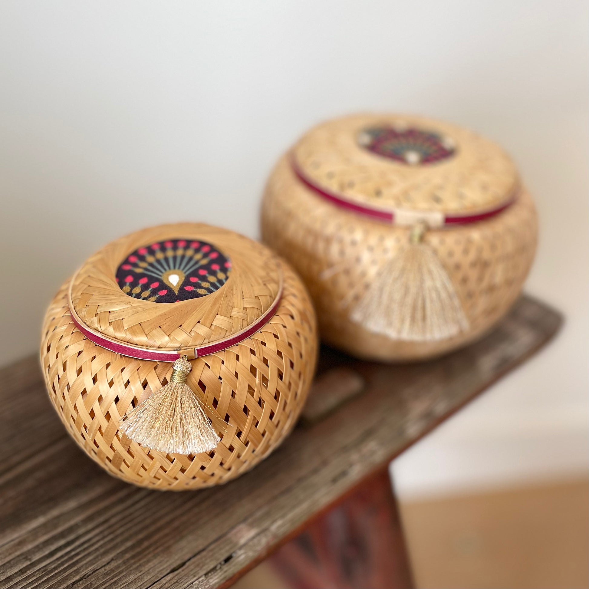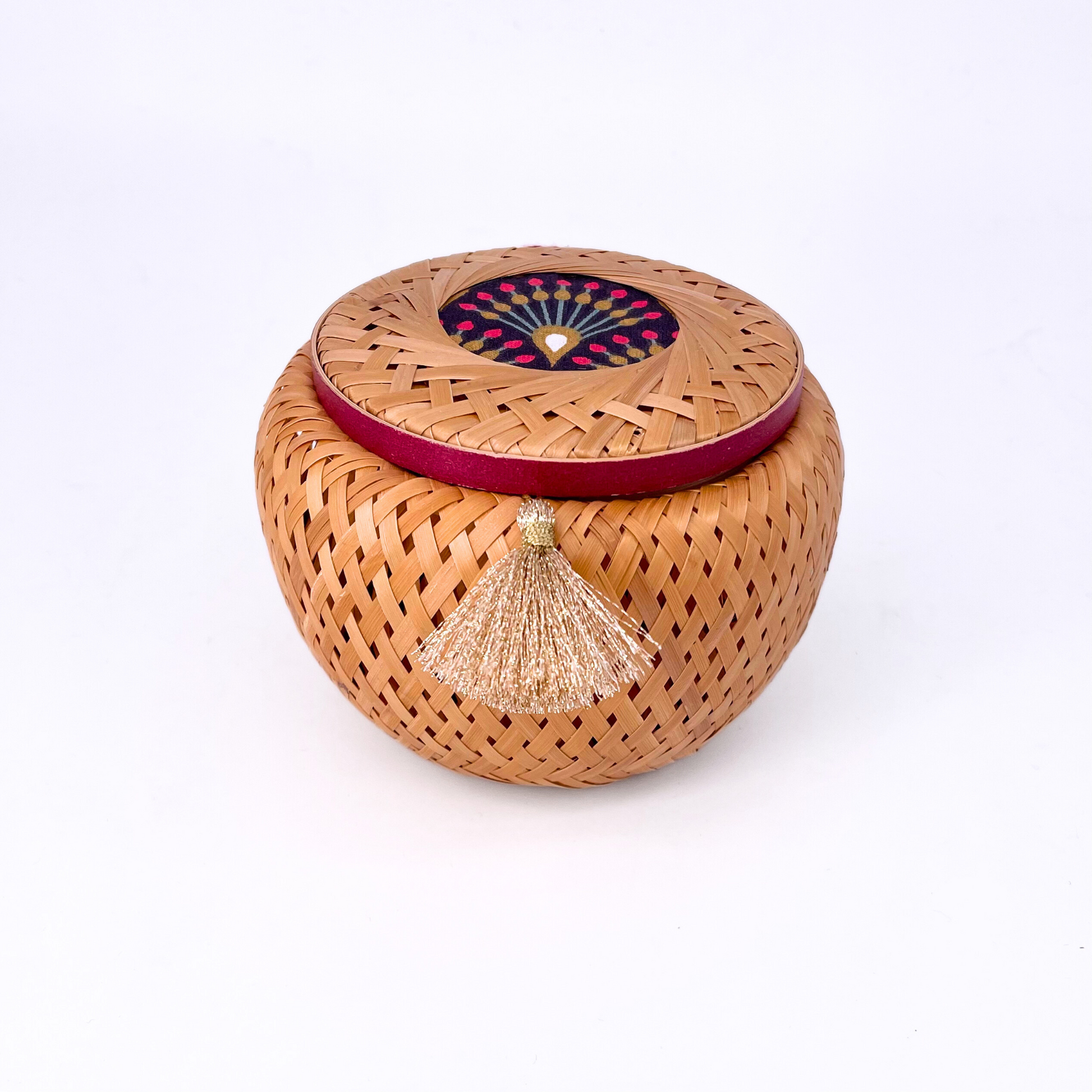 Blending heritage craftsmanship with modern understated elegance, this round-shaped basket features intricate weaving, coordinated fabric accents, washi tape, and a matching tassel. It brings a sense of calm and beauty to any space. Its versatile form is perfect for storing everyday essentials, from hair ties and cotton pads to tea bags or coffee capsules.