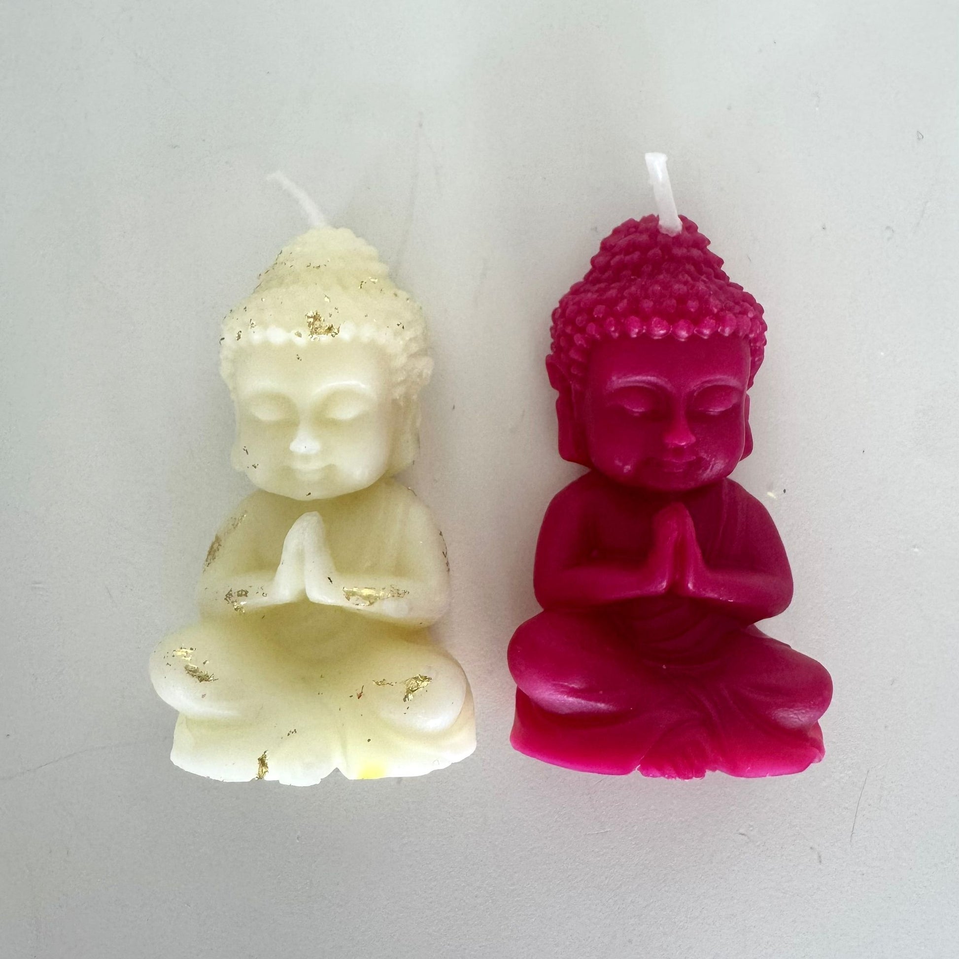 Buddha: a serene, meditating Buddha crafted from a natural beeswax–soy blend. One off-white with gold flakes, and another in a shade that beautifully complements your SAN | XIA basket.
