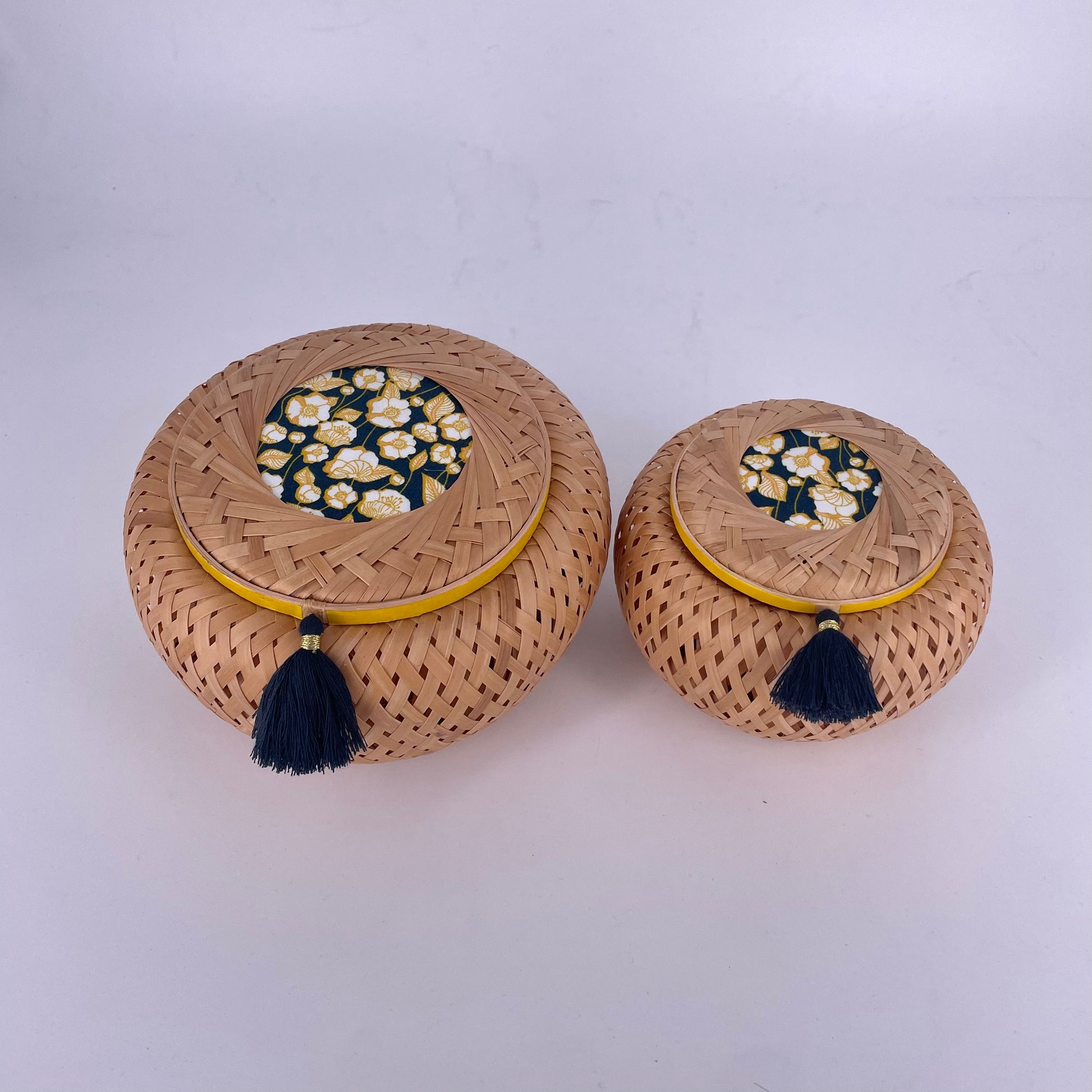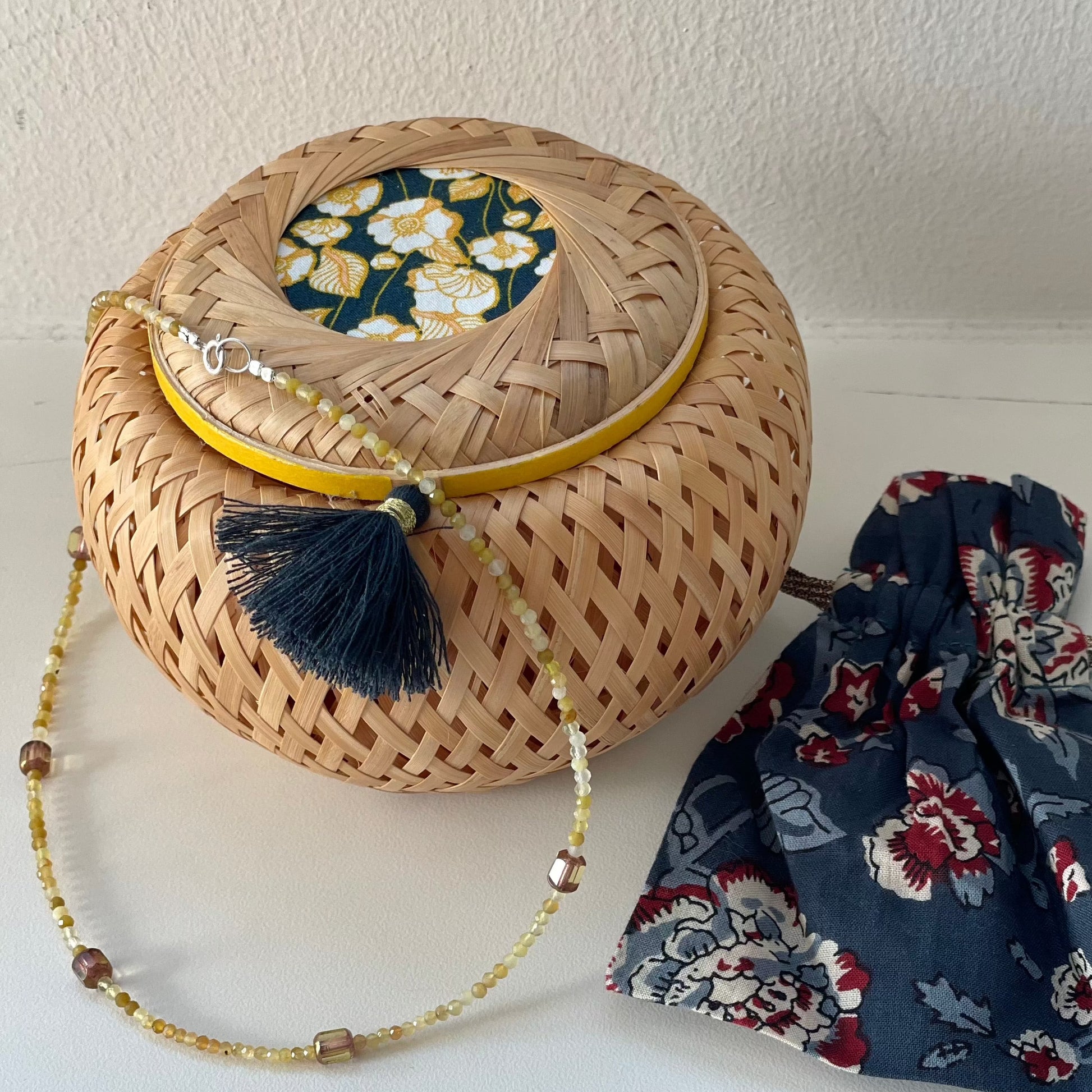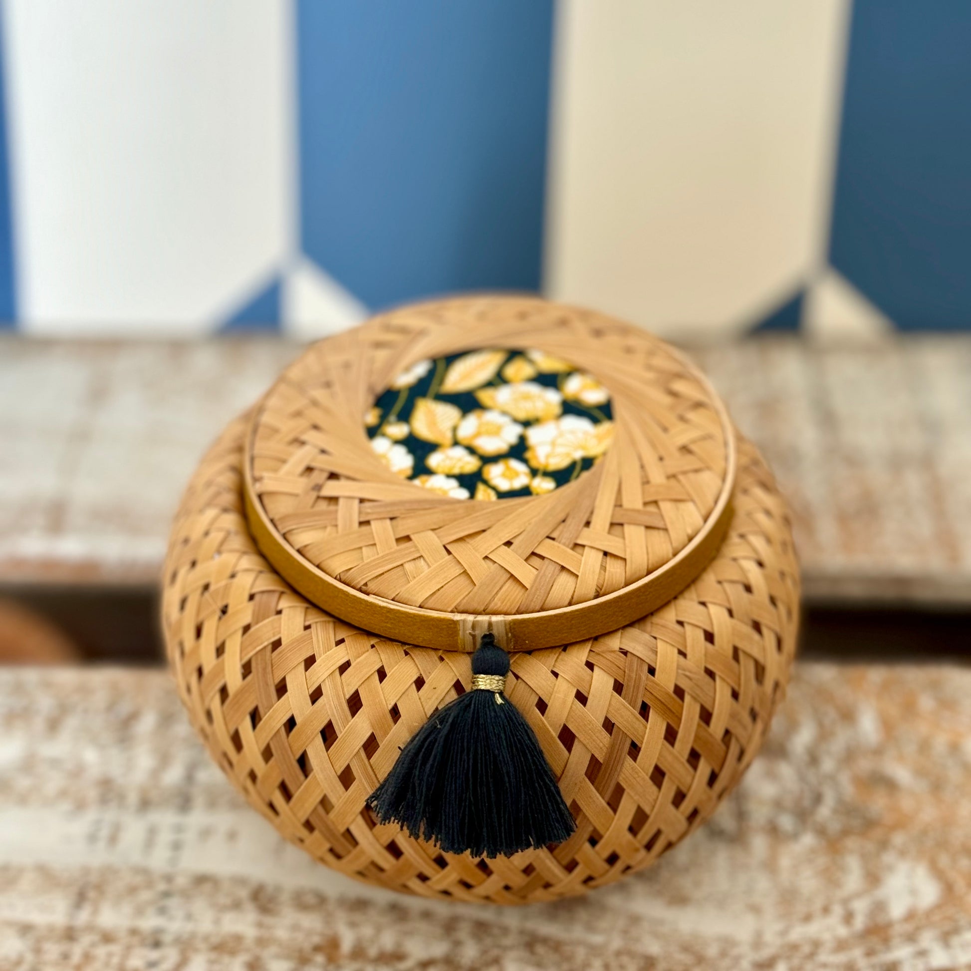 Blending heritage craftsmanship with modern understated elegance, this round-shaped basket features intricate weaving, coordinated fabric accents, washi tape, and a matching tassel. It brings a sense of calm and beauty to any space. Its versatile form is perfect for storing everyday essentials, from hair ties and cotton pads to tea bags or coffee capsules.