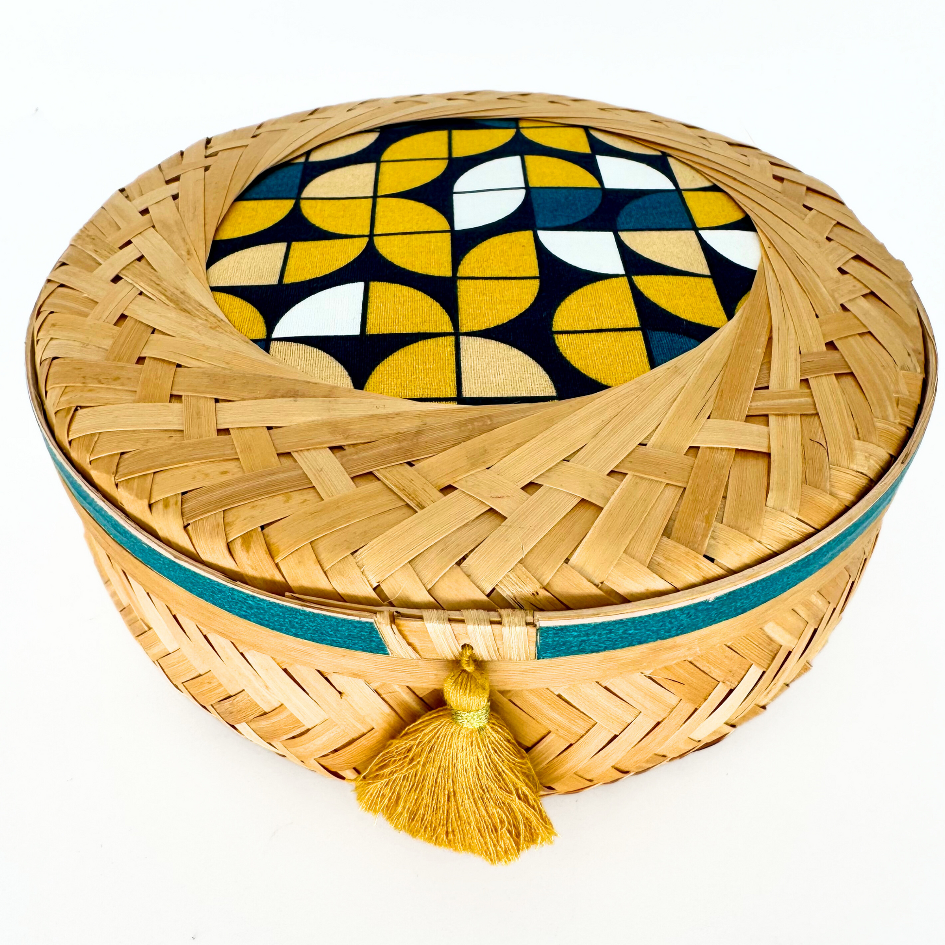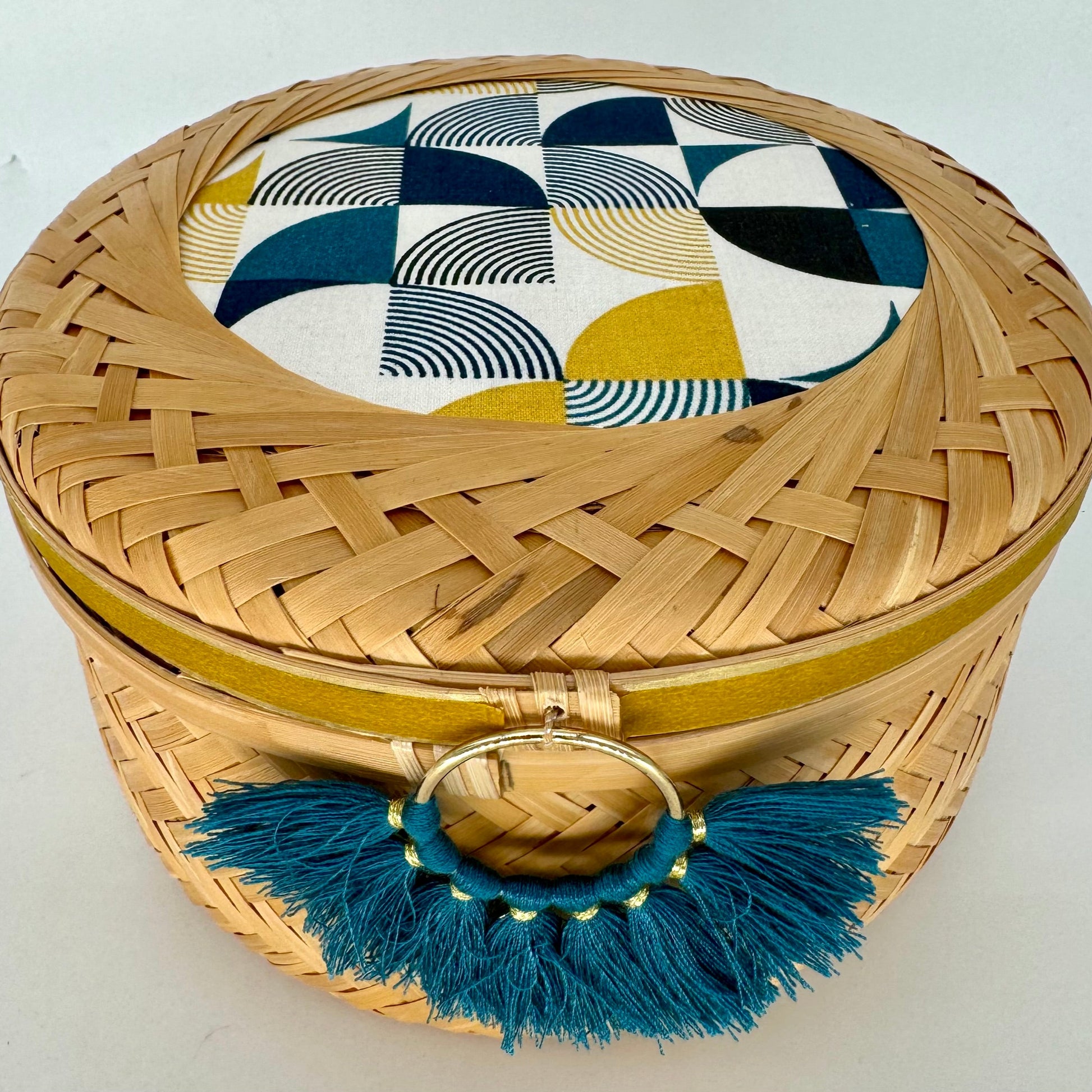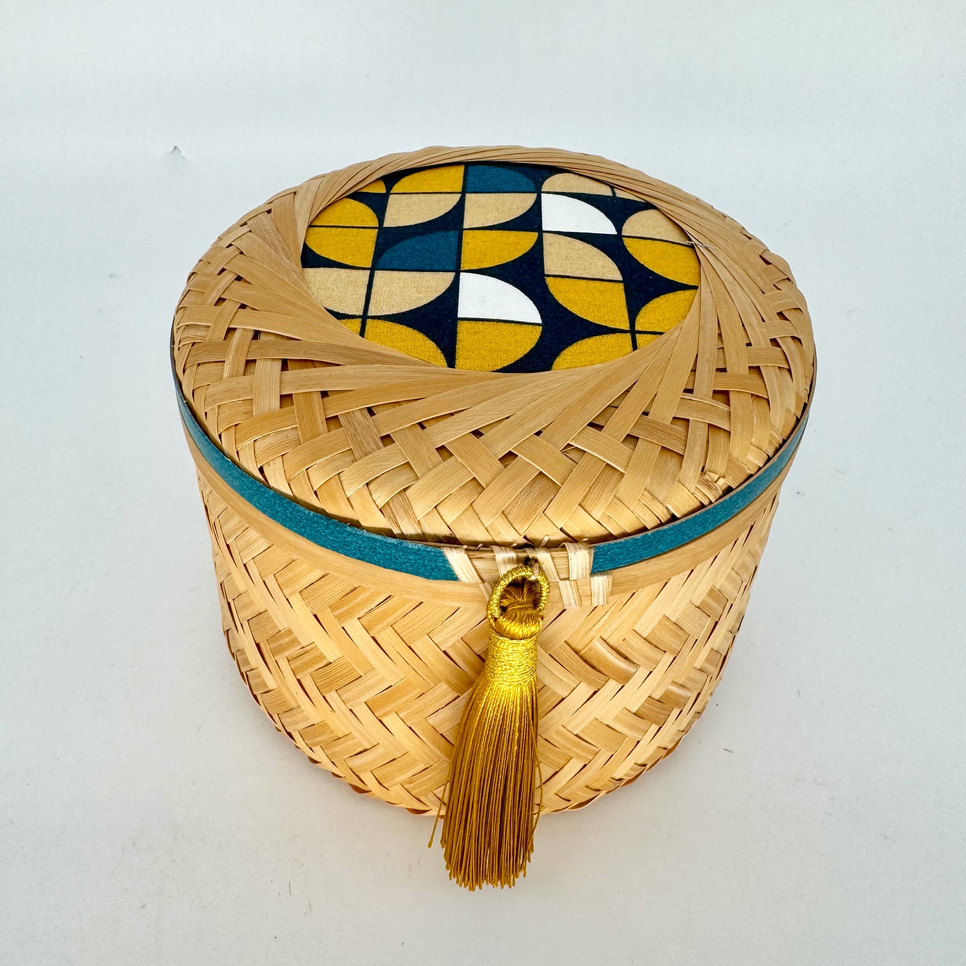 With its flat shape, this short basket makes it easy to spot and grab small items — whether jewelry like bracelets and earrings or desk essentials like paper clips and pins. The fabric-covered lid, tassel and matching washi tape, and tassel add a charming decorative touch.