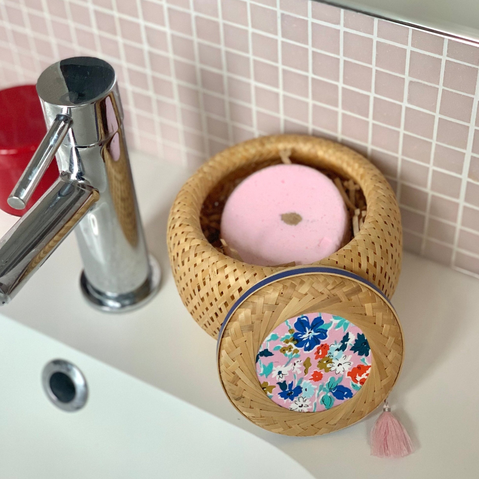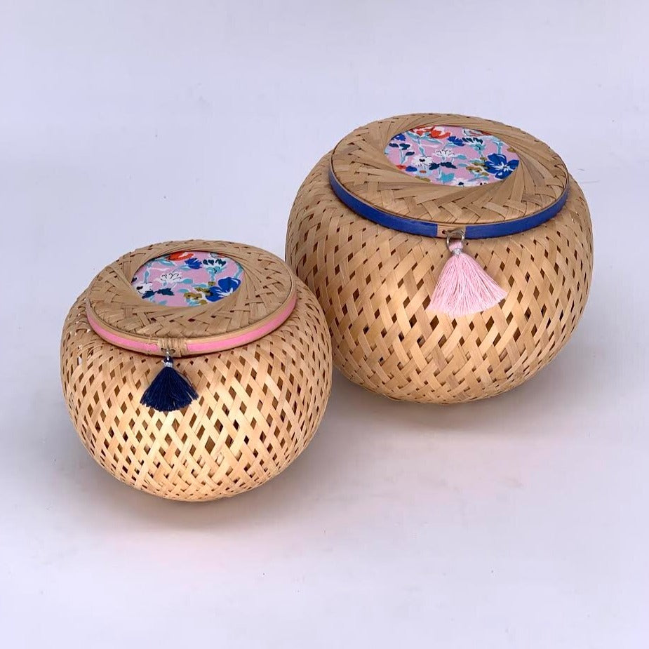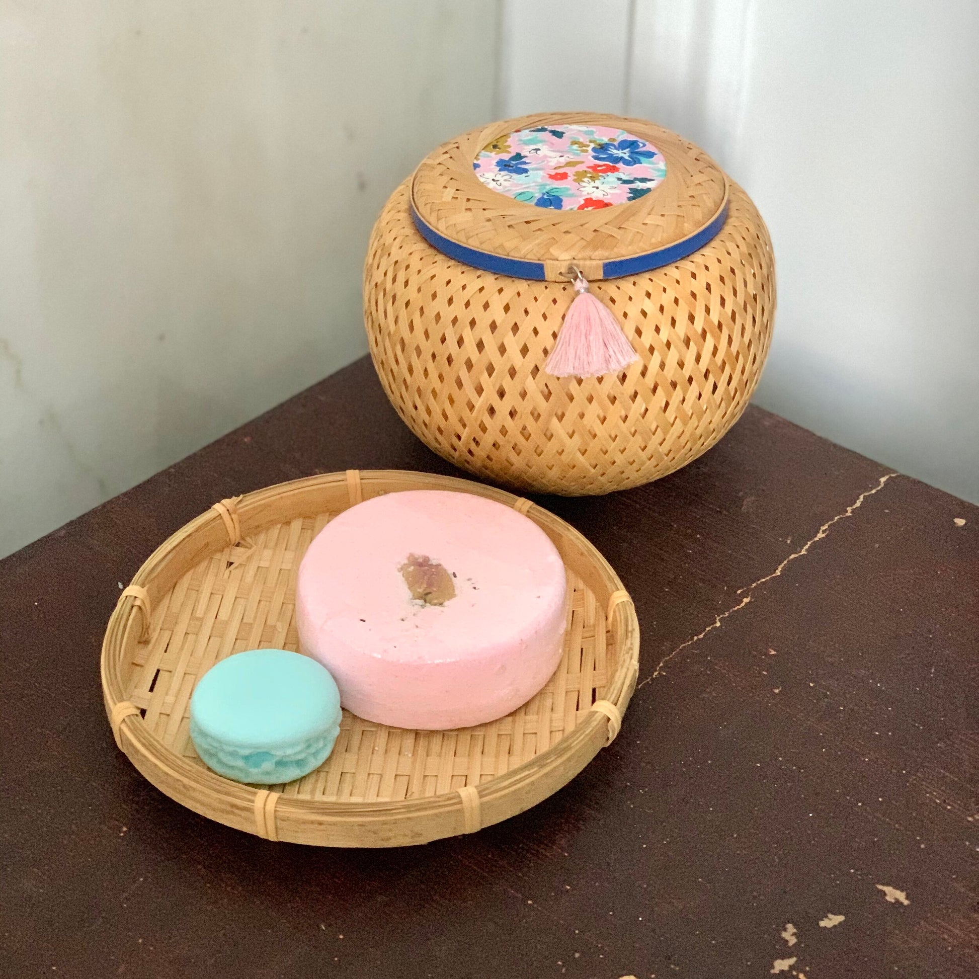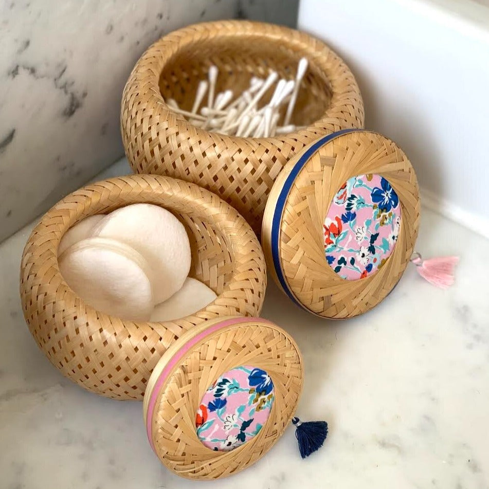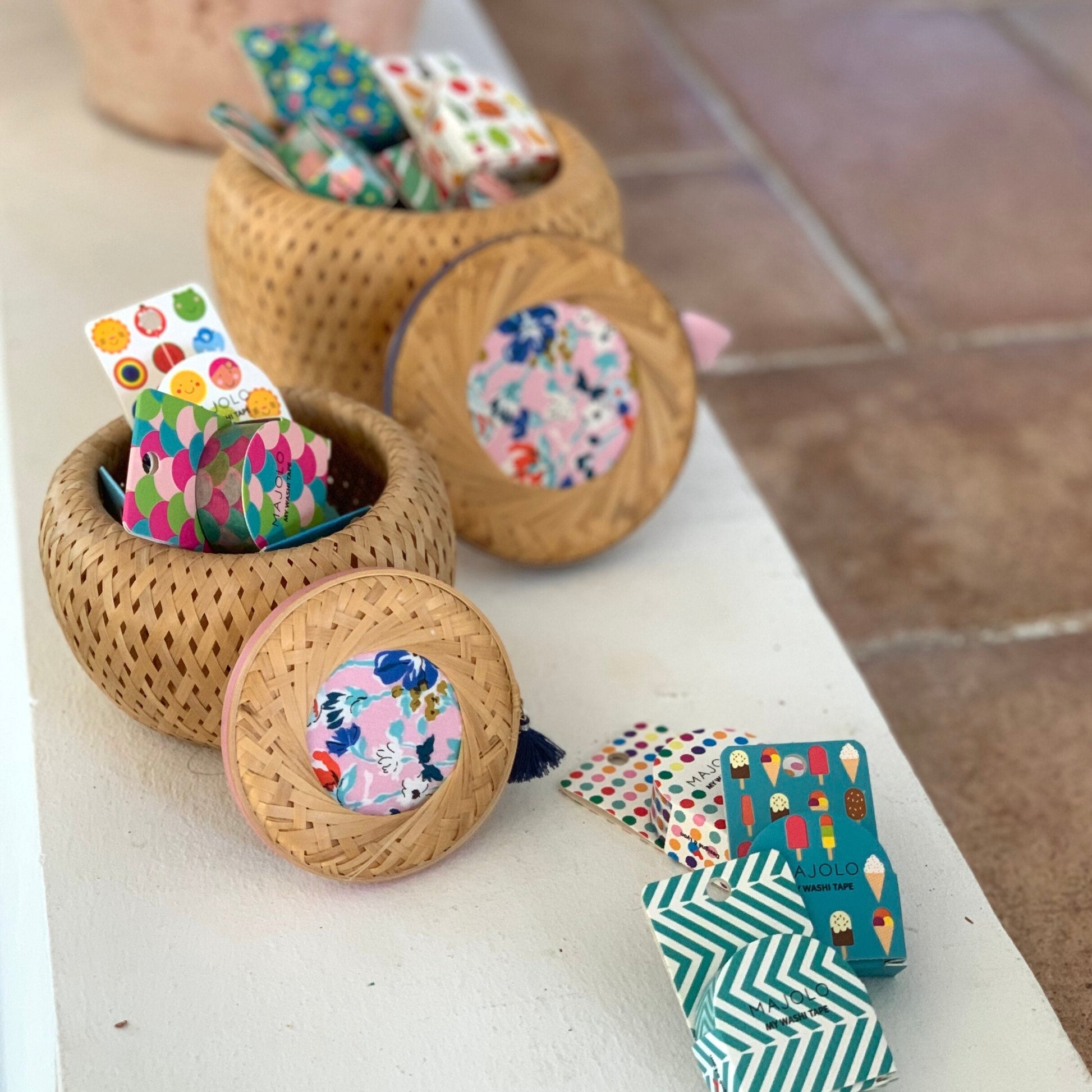 Blending heritage craftsmanship with modern understated elegance, this round-shaped basket features intricate weaving, coordinated fabric accents, washi tape, and a matching tassel. It brings a sense of calm and beauty to any space. Its pratical shape is perfect for holding things like skincare samples, jewelry pieces, small candles, or washi tape collections.