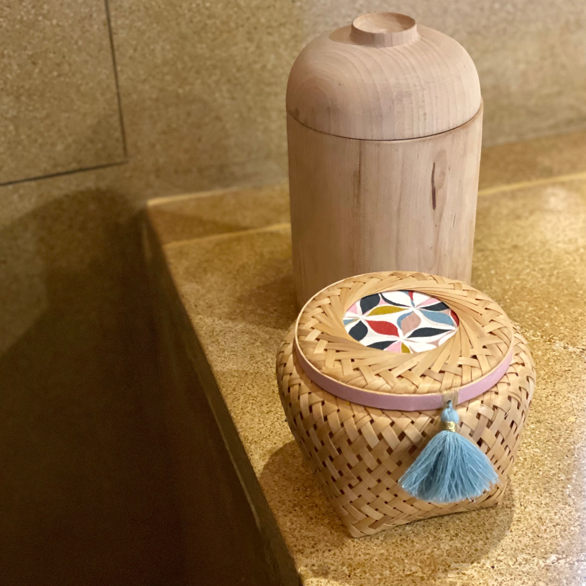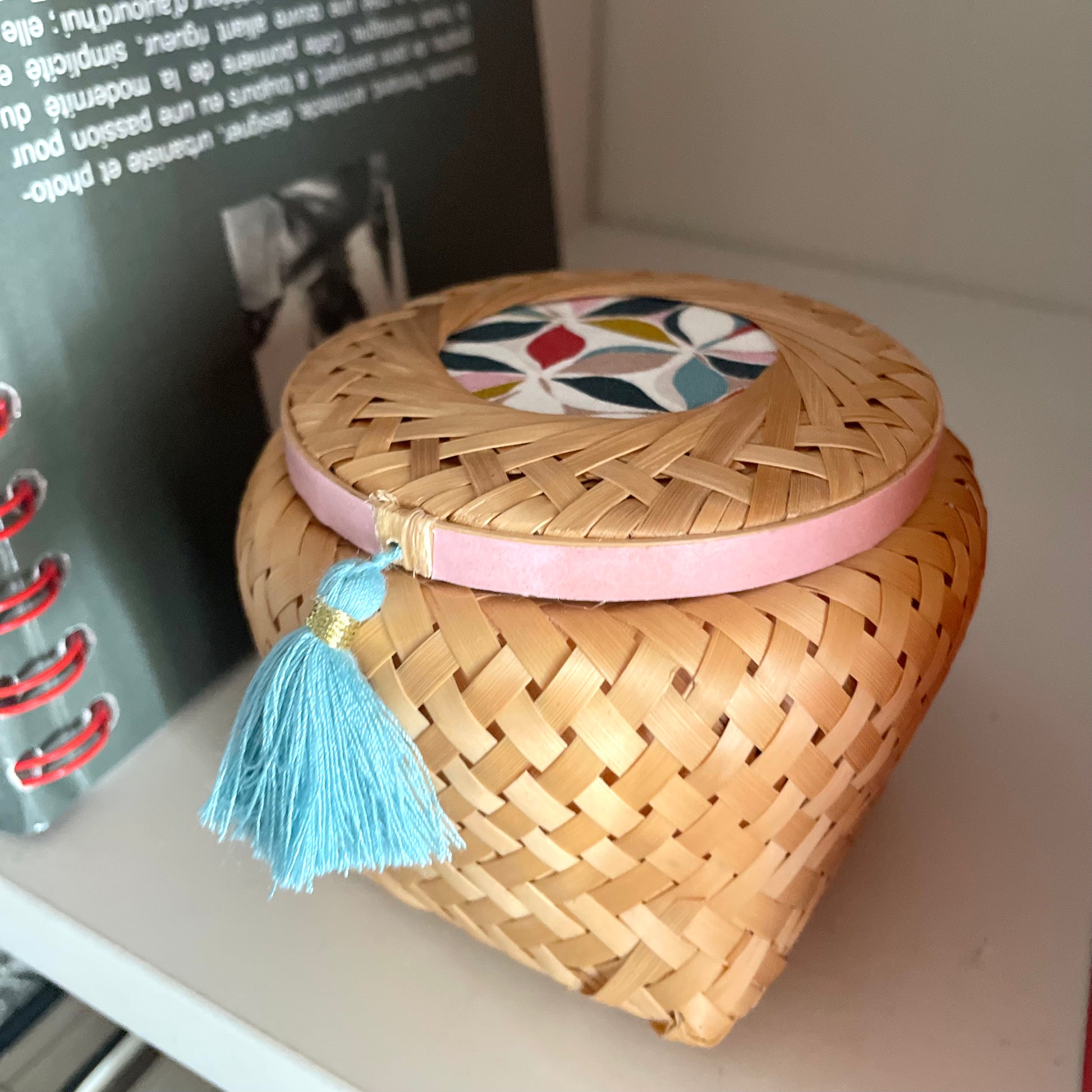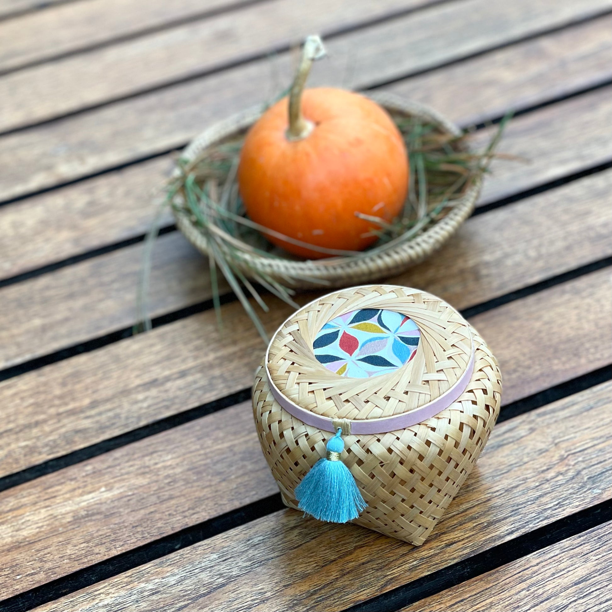 A modern twist on traditional Asian weaving, this bamboo basket features a square base and a softly rounded lid, creating a graceful silhouette. It’s adorned with a delicate fabric, a matching tassel, and decorative washi tape — each element carefully chosen to complement the basket’s natural tones and add a touch of charm. Its natural texture brings warmth, while the compact size makes it perfect for storing lipsticks, hair clips, or other small essentials.