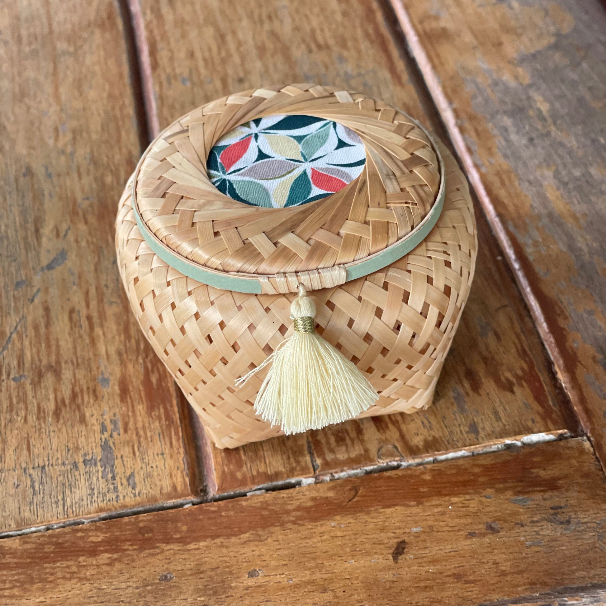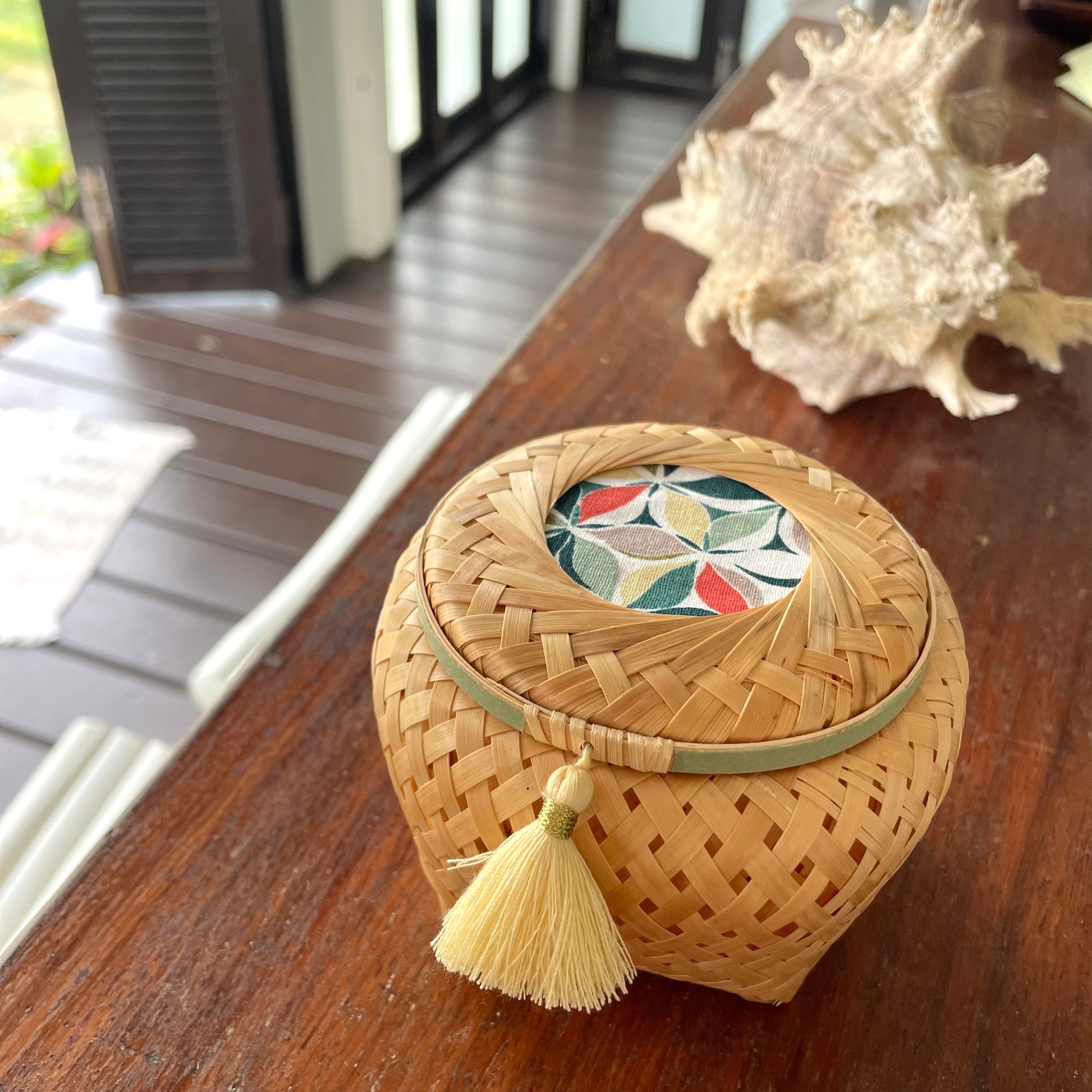 A modern twist on traditional Asian weaving, this bamboo basket features a square base and a softly rounded lid, creating a graceful silhouette. It’s adorned with a delicate fabric, a matching tassel, and decorative washi tape — each element carefully chosen to complement the basket’s natural tones and add a touch of charm. Its natural texture brings warmth, while the compact size makes it perfect for storing lipsticks, hair clips, or other small essentials.