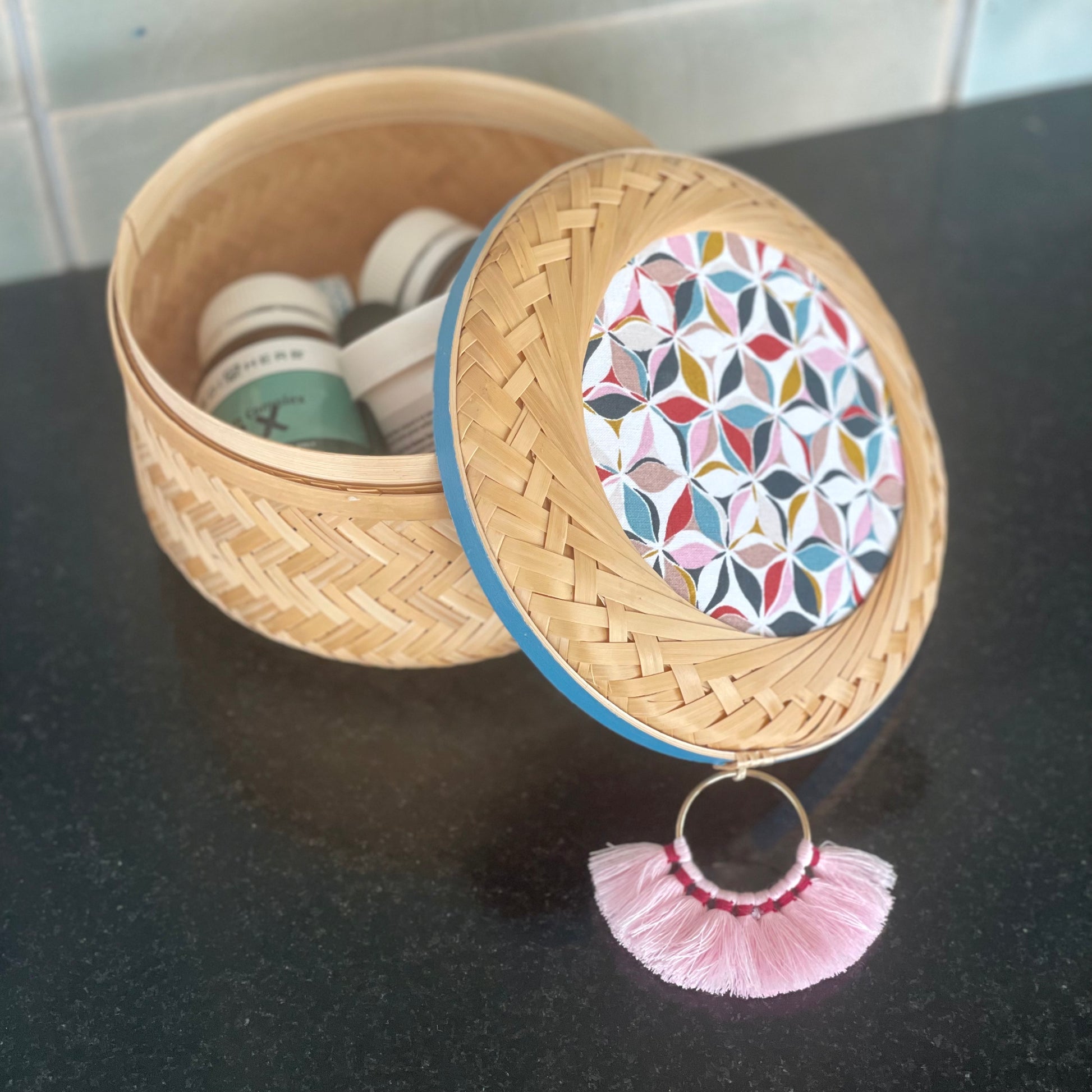 This cylindrical bamboo basket combines natural texture with modern style, elevated by a unique & charming tassel. Just the right size for essential oils or wrapped snacks, it keeps your essentials organized while adding a refined touch to your space.
