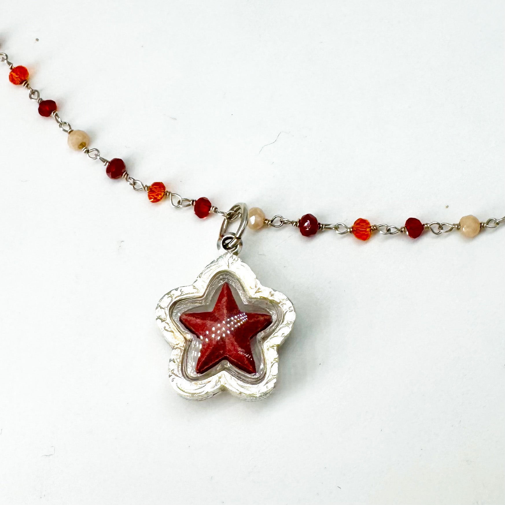 This elegant necklace features a multi-colored stone chain, beautifully accented with a star-shaped amulet. Its extendable design ensures a comfortable, customizable fit, blending style with practicality. In Thai culture, star amulets are ancient protective charms — symbols of light in the dark, hope, and the belief that good things lie ahead. Wearing this necklace is an invitation for luck and protection to accompany you on every journey.