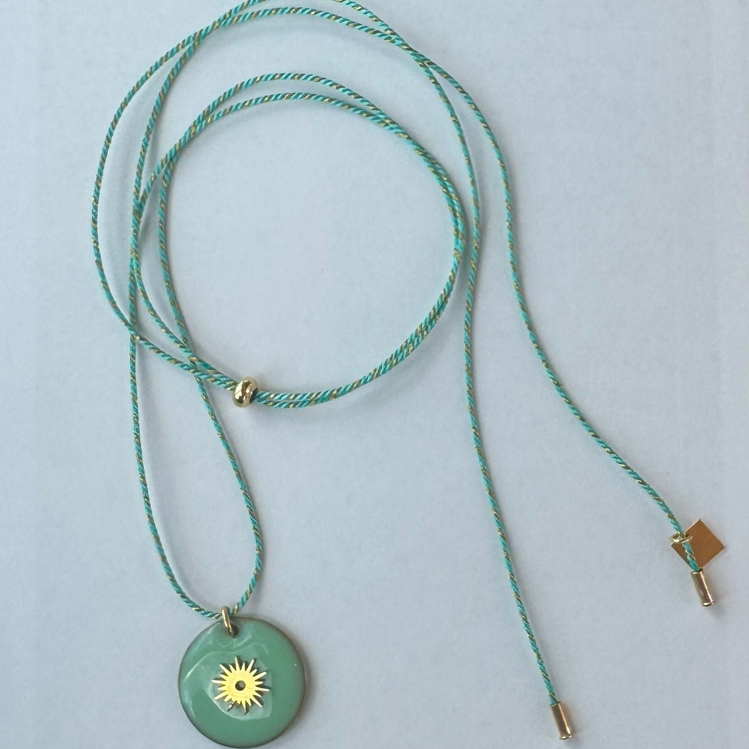 This versatile piece transforms from necklace to bracelet, featuring an enameled circle medal with a radiant sun motif. Balancing elegance and joy, it’s a timeless accessory that brightens any outfit and suits every generation.