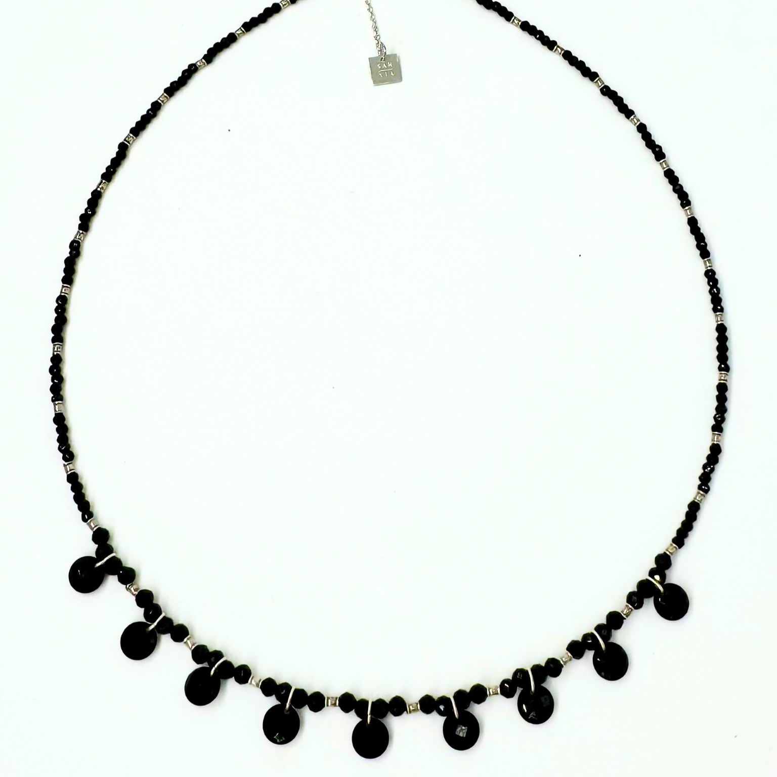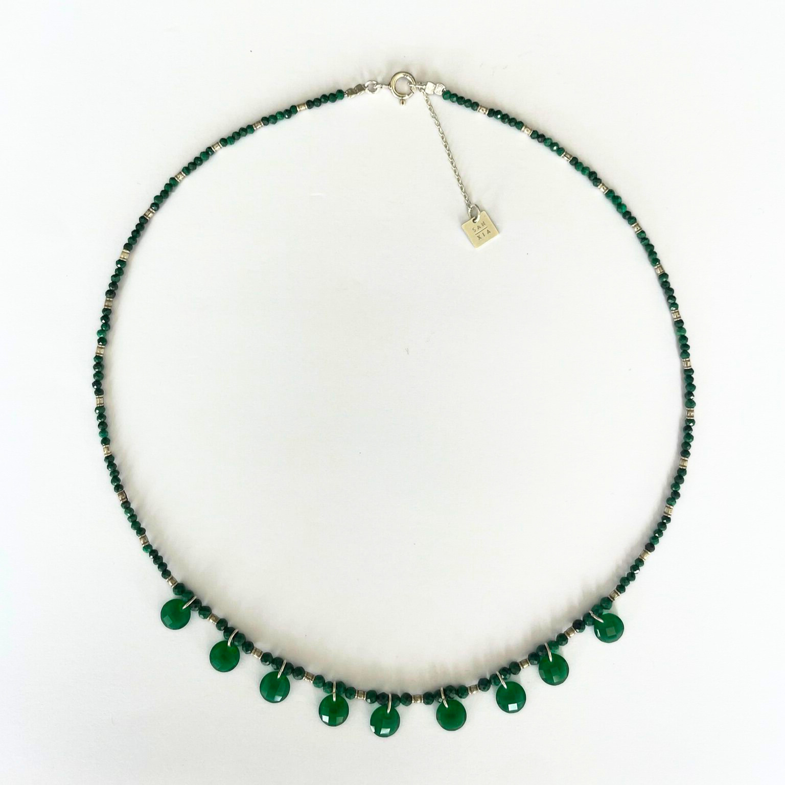 This elegant choker features nine dangling glass beads delicately paired with matching colored stones and sterling silver accents, bringing personality and a touch of refined elegance to any ensemble, whether worn solo or layered, while its adjustable extension chain ensures a customizable fit for comfort and style.